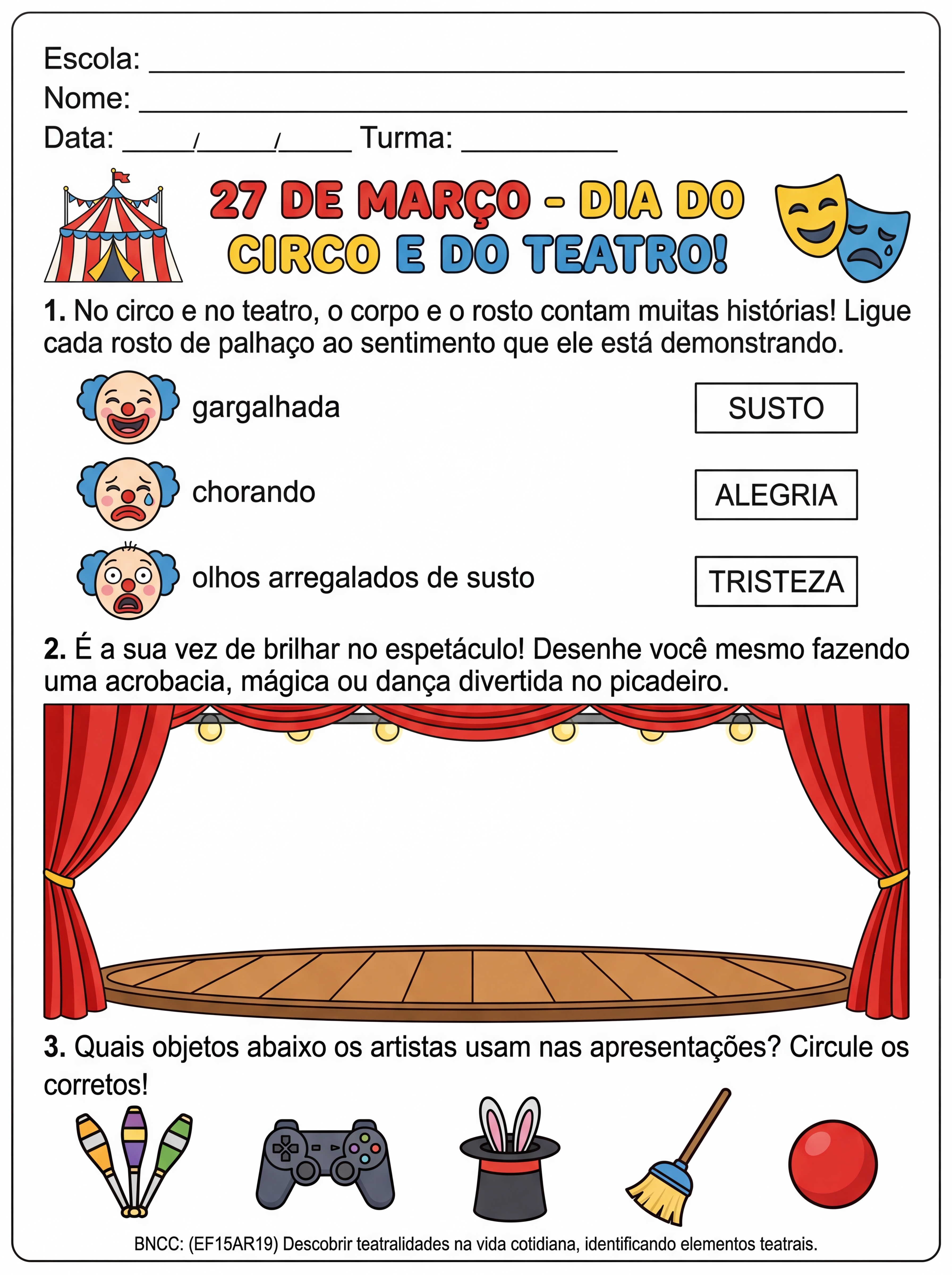 Atividade: 27 de Março – Dia do Circo (e Dia Mundial do Teatro): Explora a ludicidade, artes e expressão corporal.