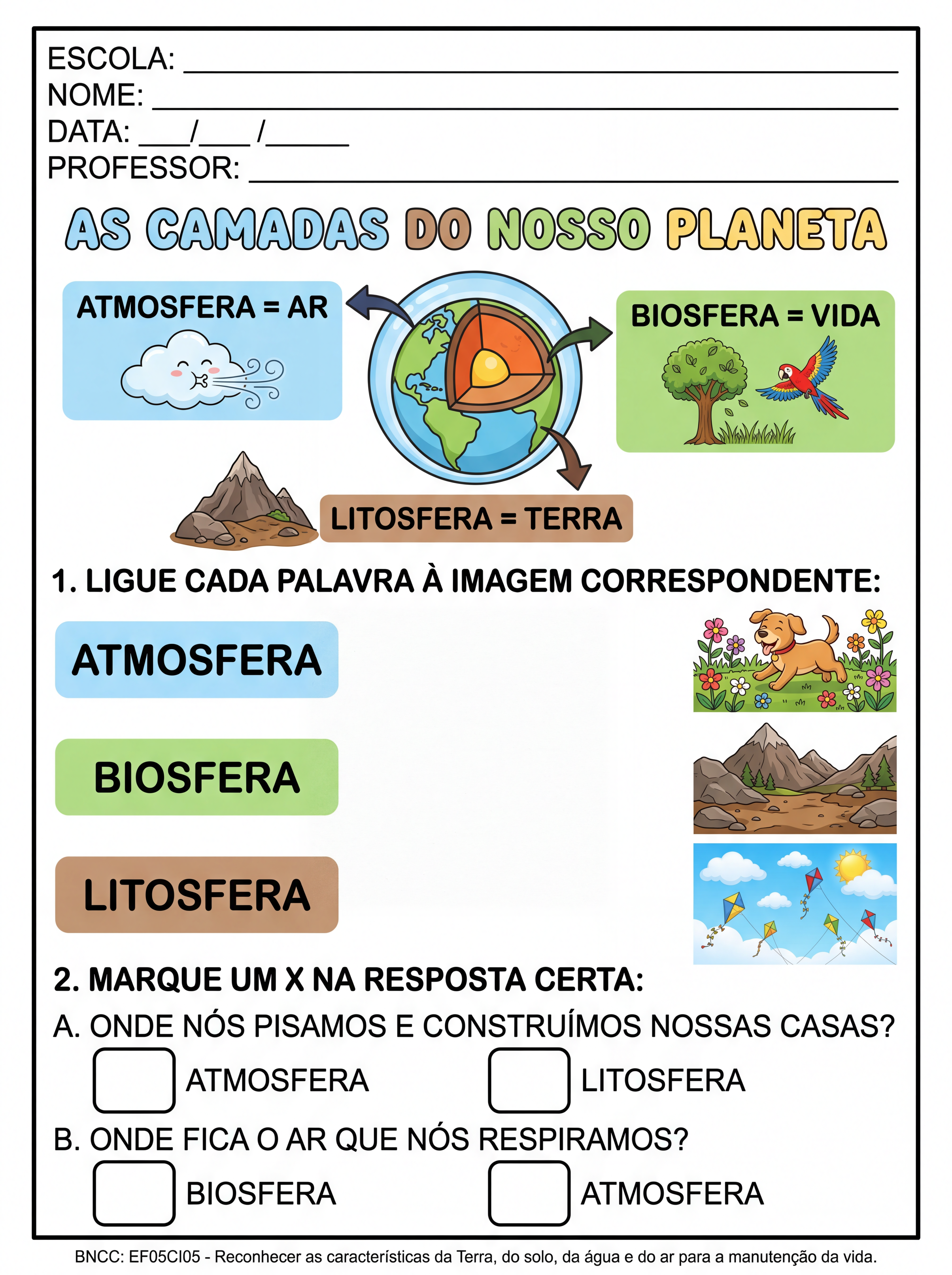 Atividade: atividade adaptada para aluno especial a nivel de 5 ano SOBRE ATMOSFERA, BIOSFERA E LITOSFERA