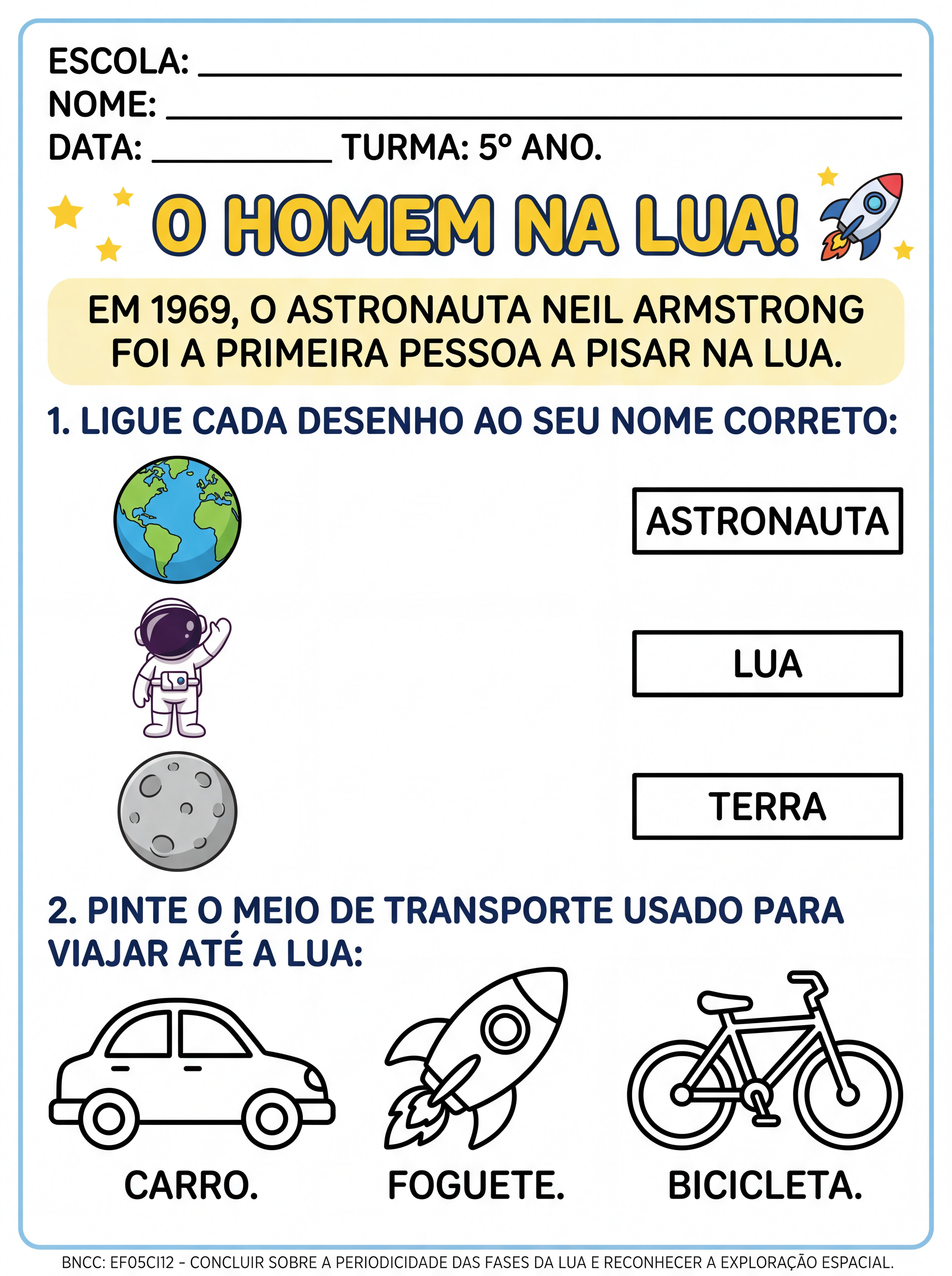 Atividade: atividade adaptada para aluno especial a nivel de 5 ano sobre  a ida  do homem a  Lua