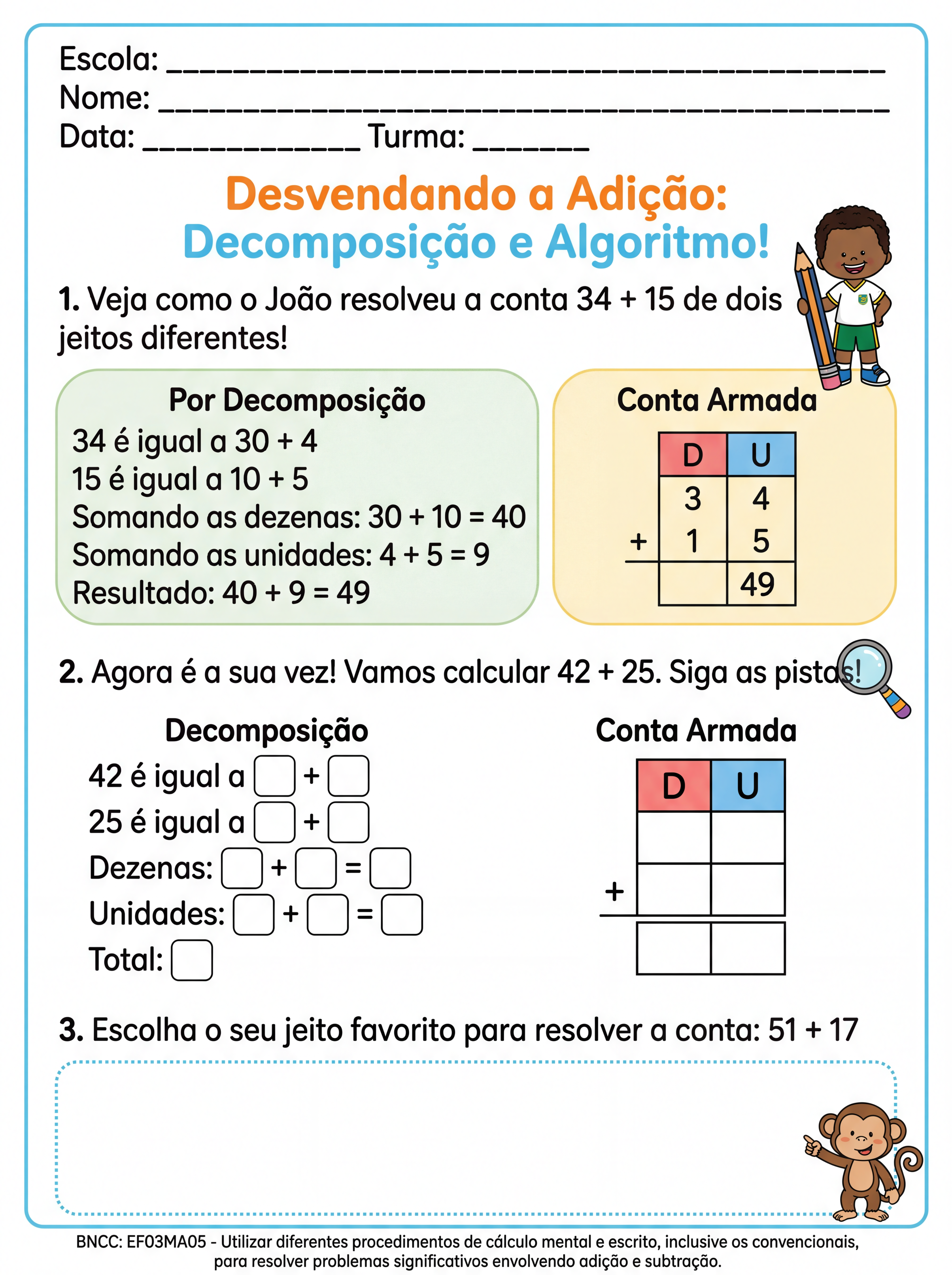 Atividade algoritmos convencional e decomposição 3 ano para alunos com dificuldade