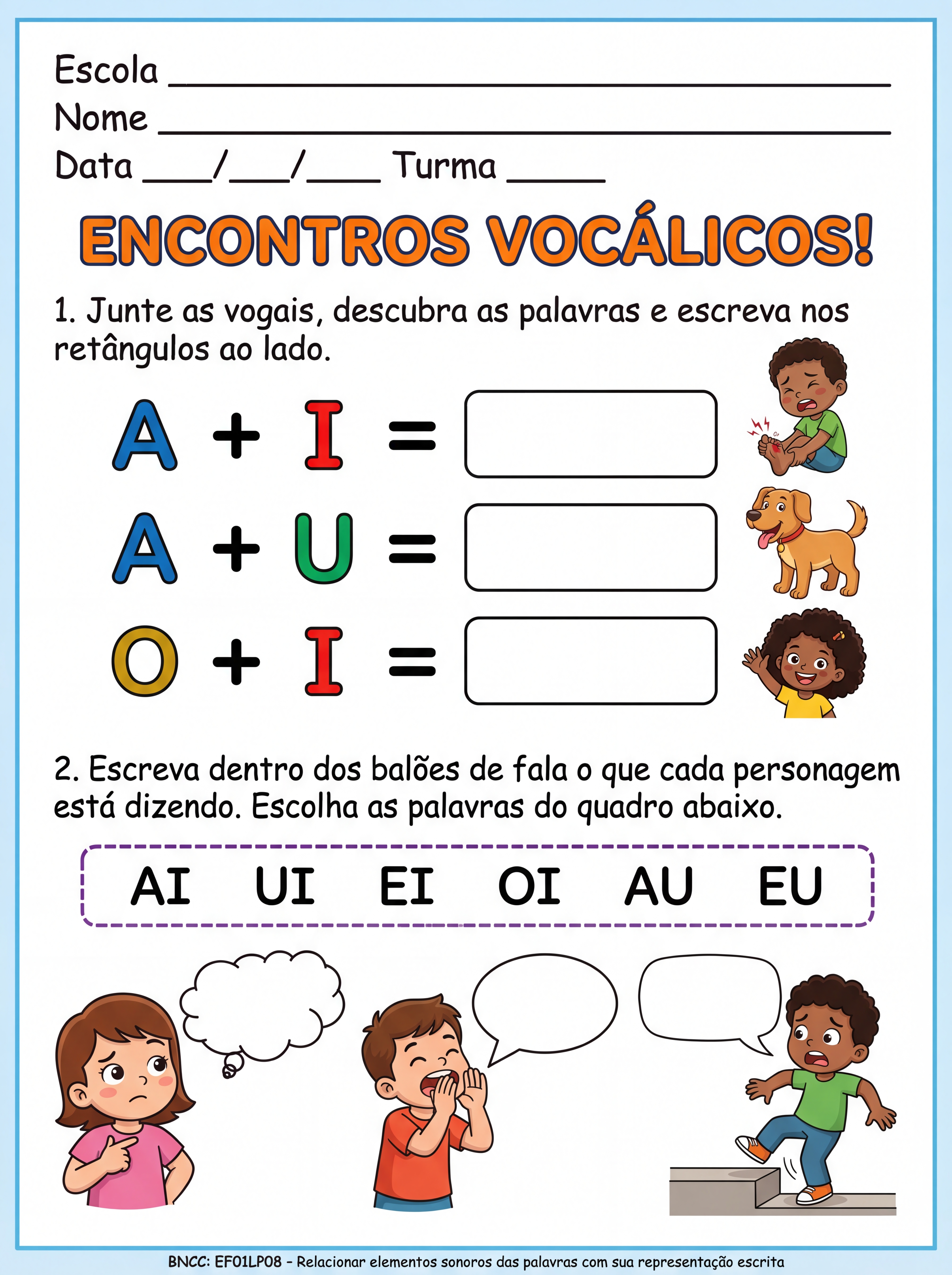 Atividade de alfabetização com encontros vocálicos