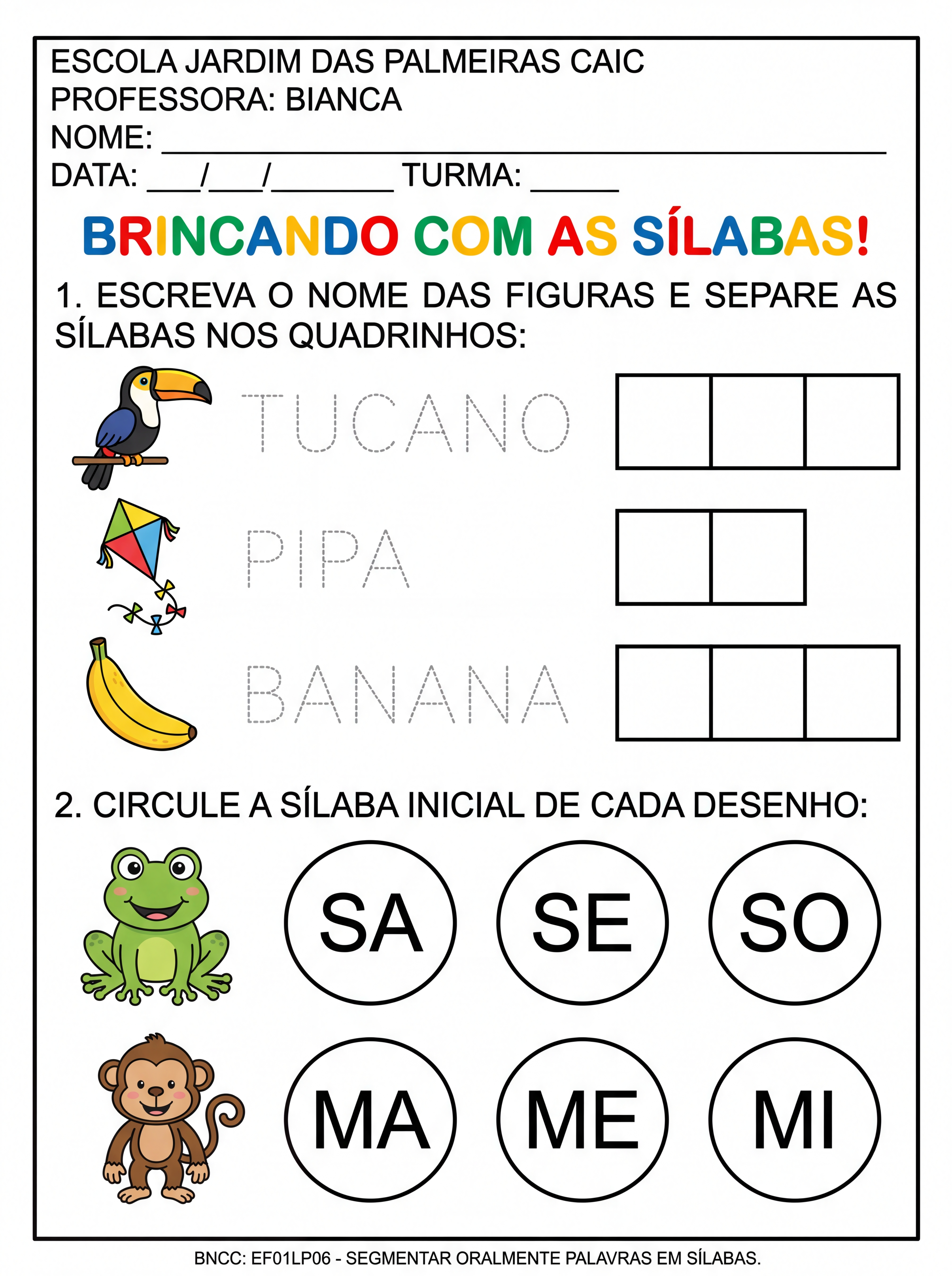 atividade de alfabetização com imagens, separação de silabas e outras. com cabeçalho. tudo com letra bastão. escola jardim das palmeiras caic (maiusculo) professora: Bianca nome: