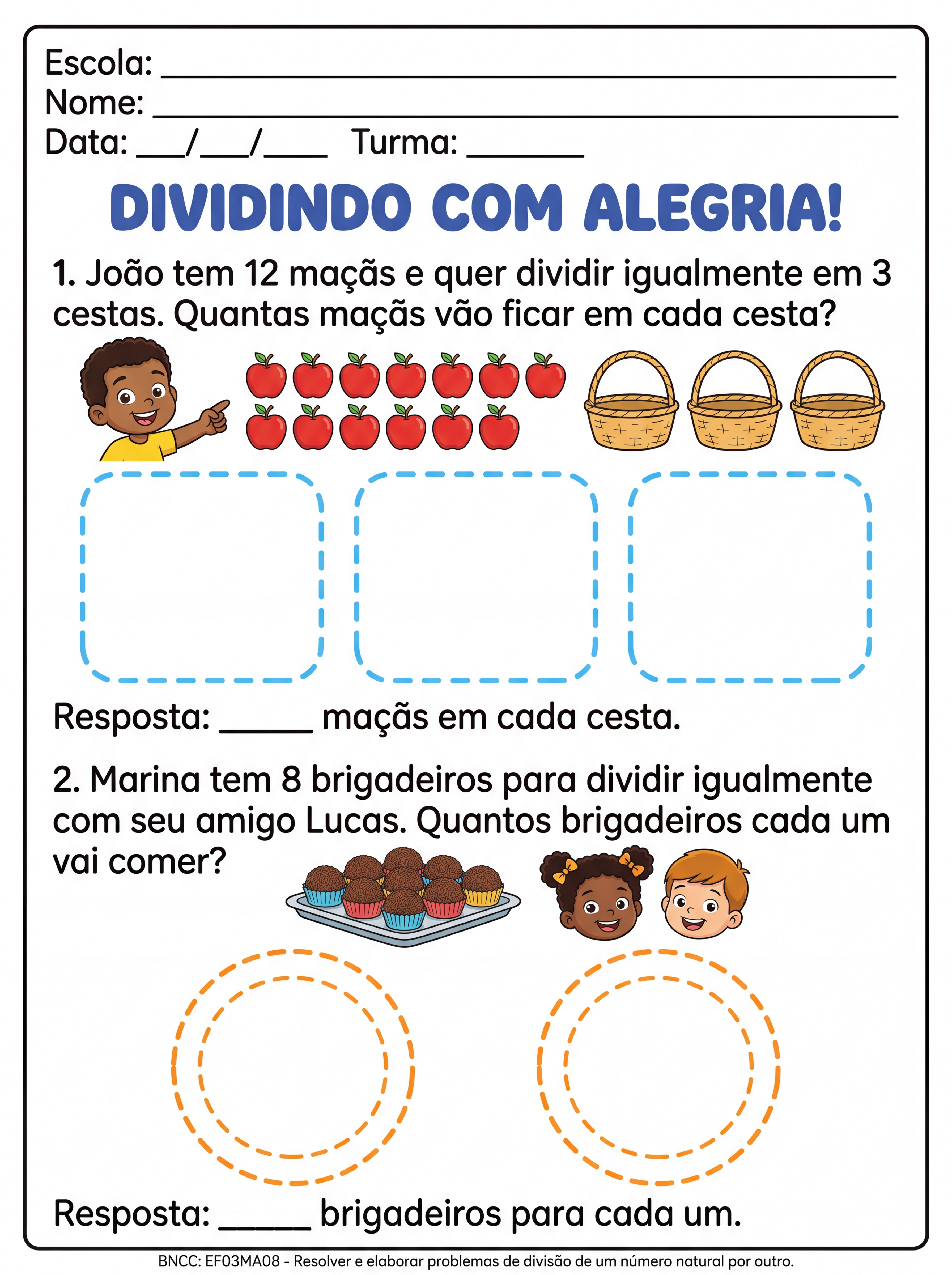 Atividade de divisão para alunos com dificuldade. Espaços amplos para respostas