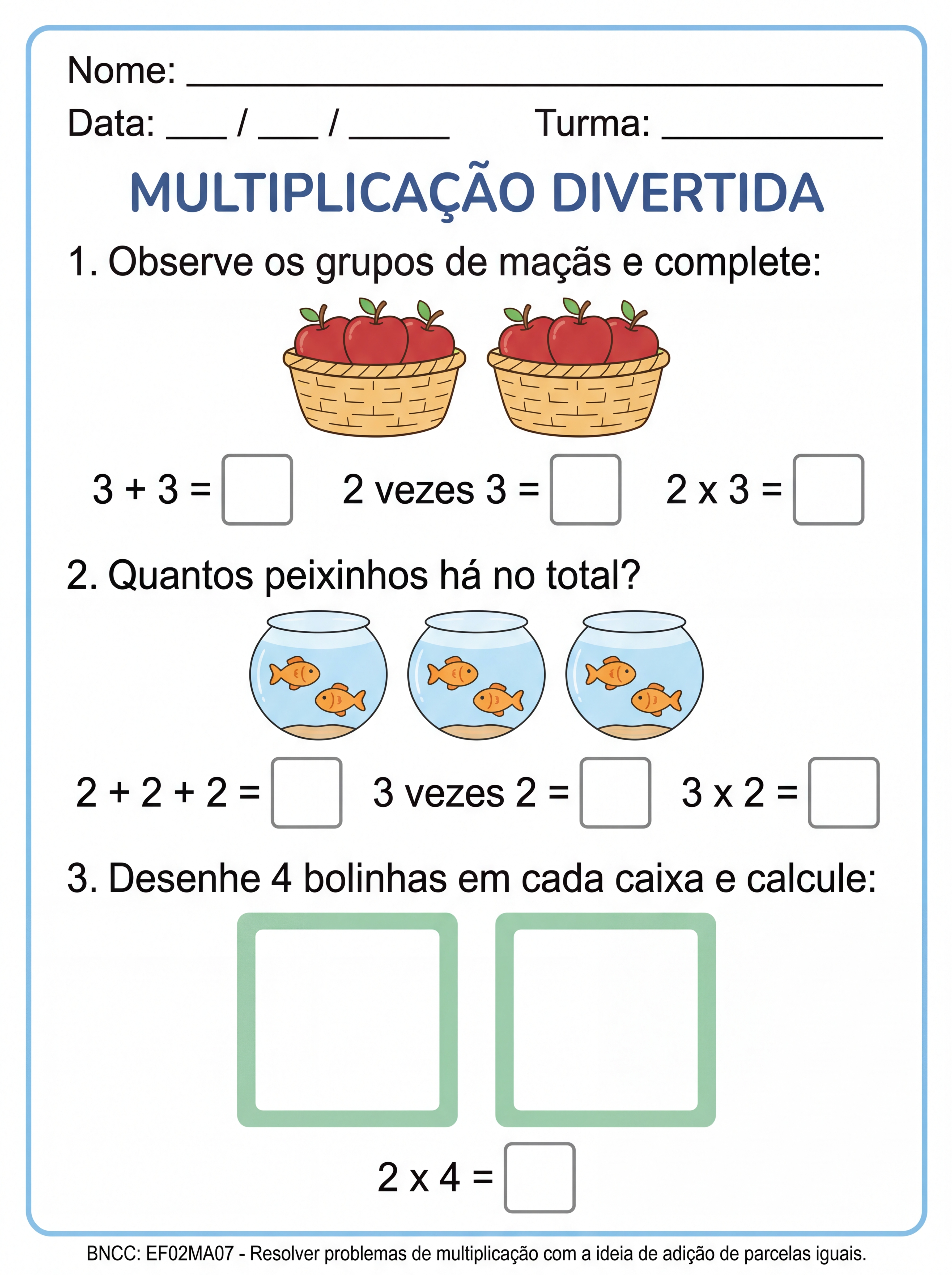 Atividade de multiplicação para alunos com tdah. Espaços amplos para respostas