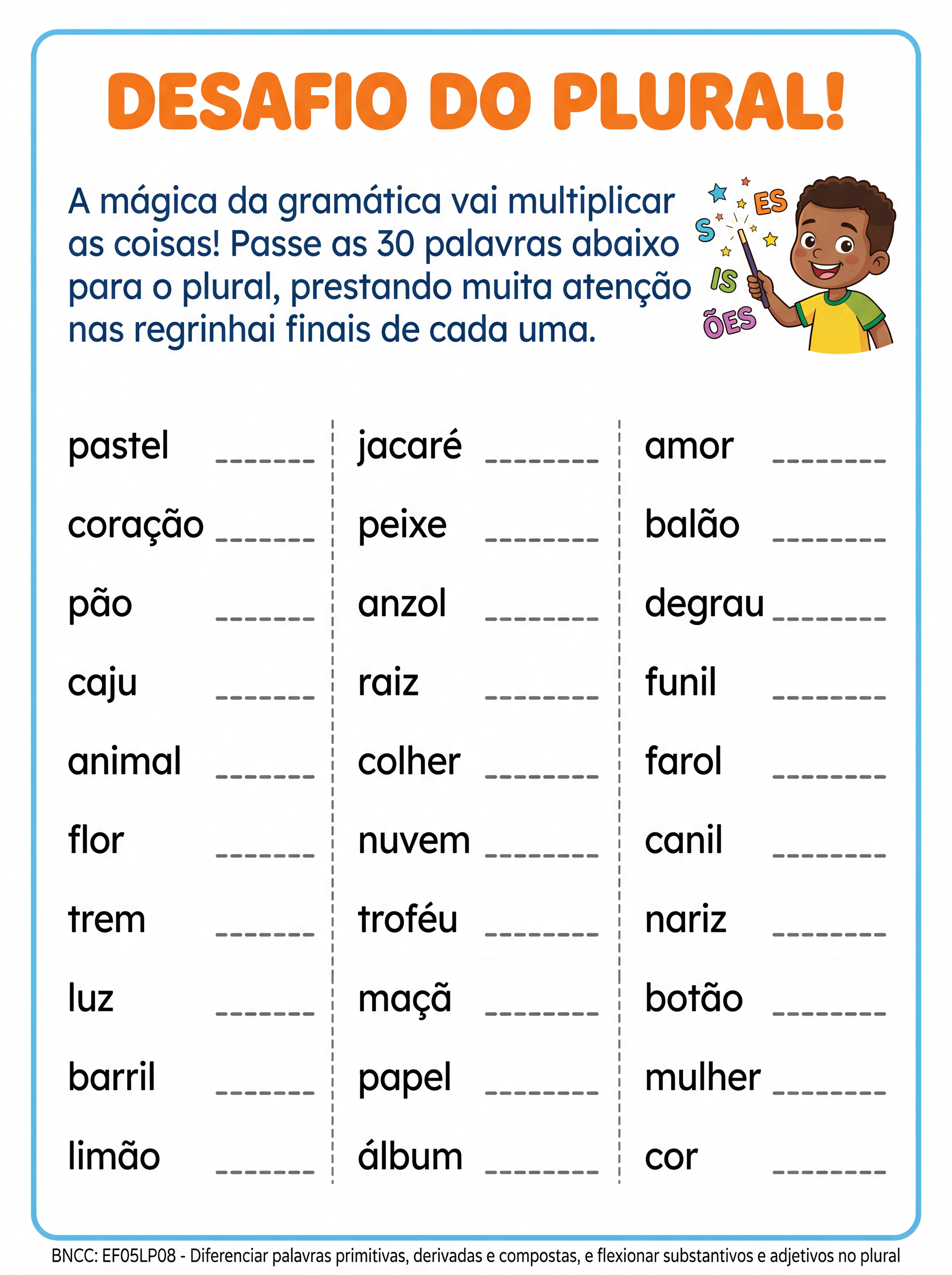 Atividade de para casa 5° ano passar palavras para plural 30 palavras