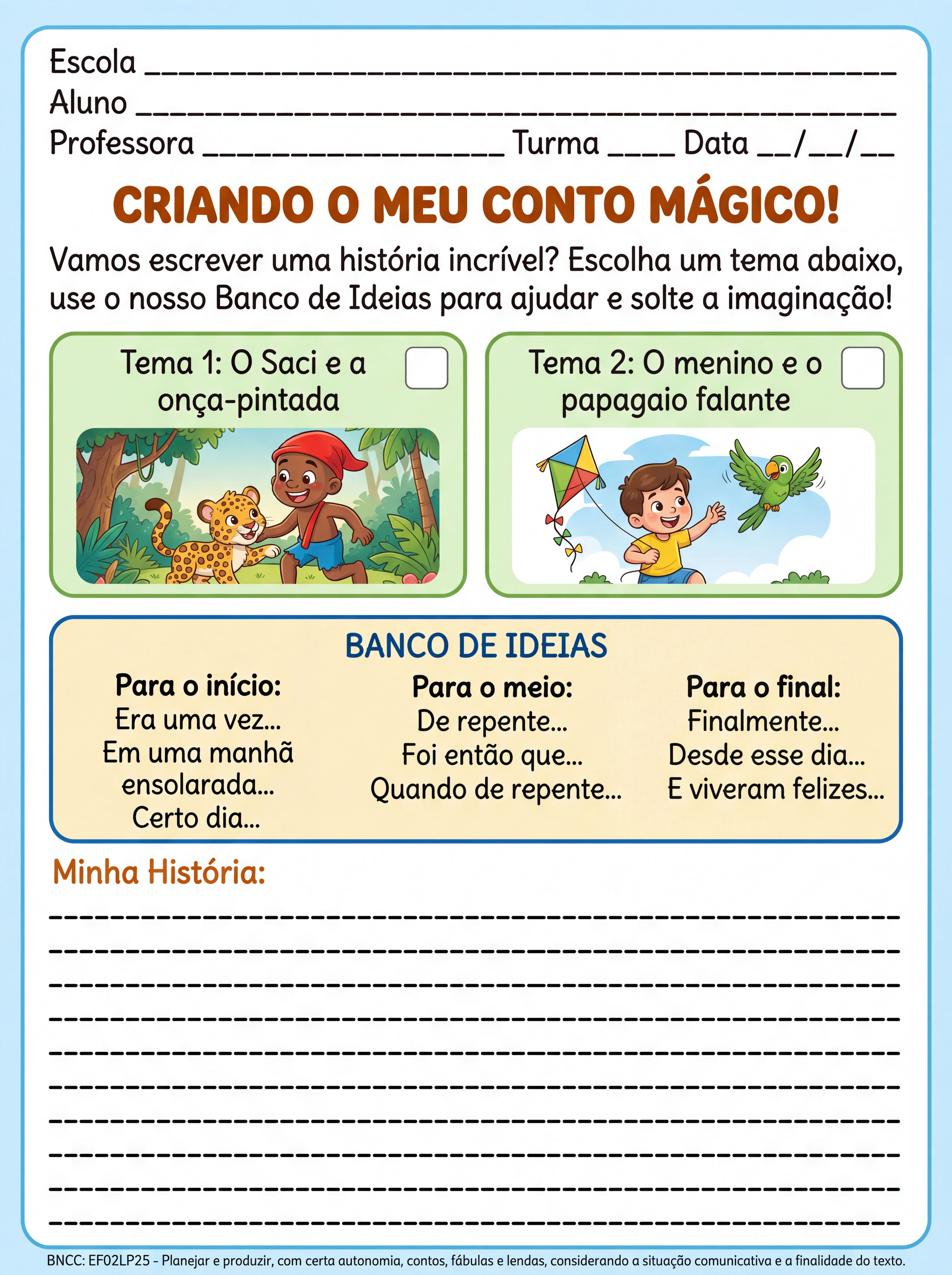 Atividade para produção de texto fase inicial 2ano ensino fundamental com alternativas sugestões de frases para usar no início meio e final do texto. Genero literário contos formato narrativo com temas e ilustrações de sugestão