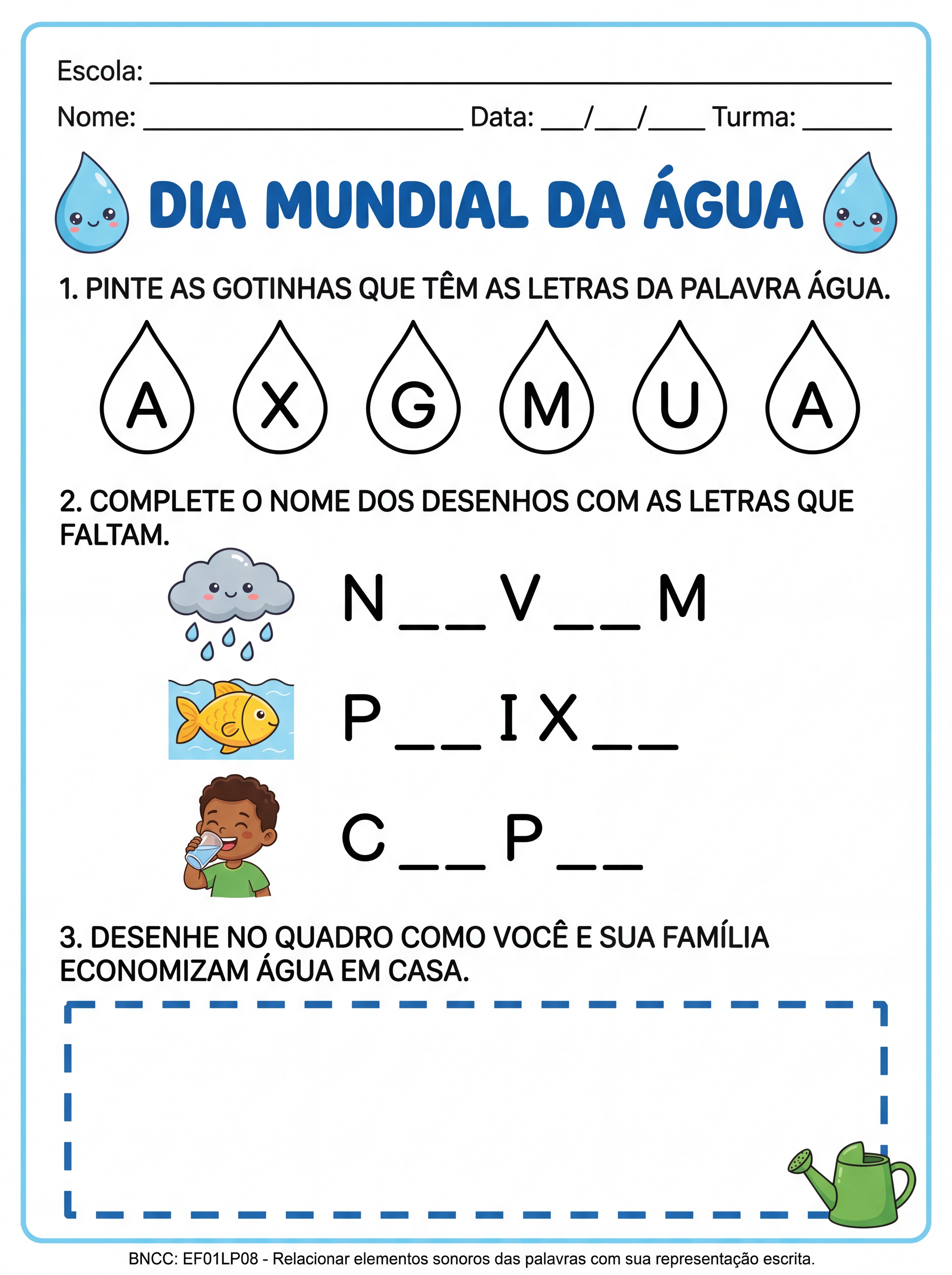 Atividade: ATIVIDADE SOBRE DIA DA AGUA ALFABETIZAÇAO