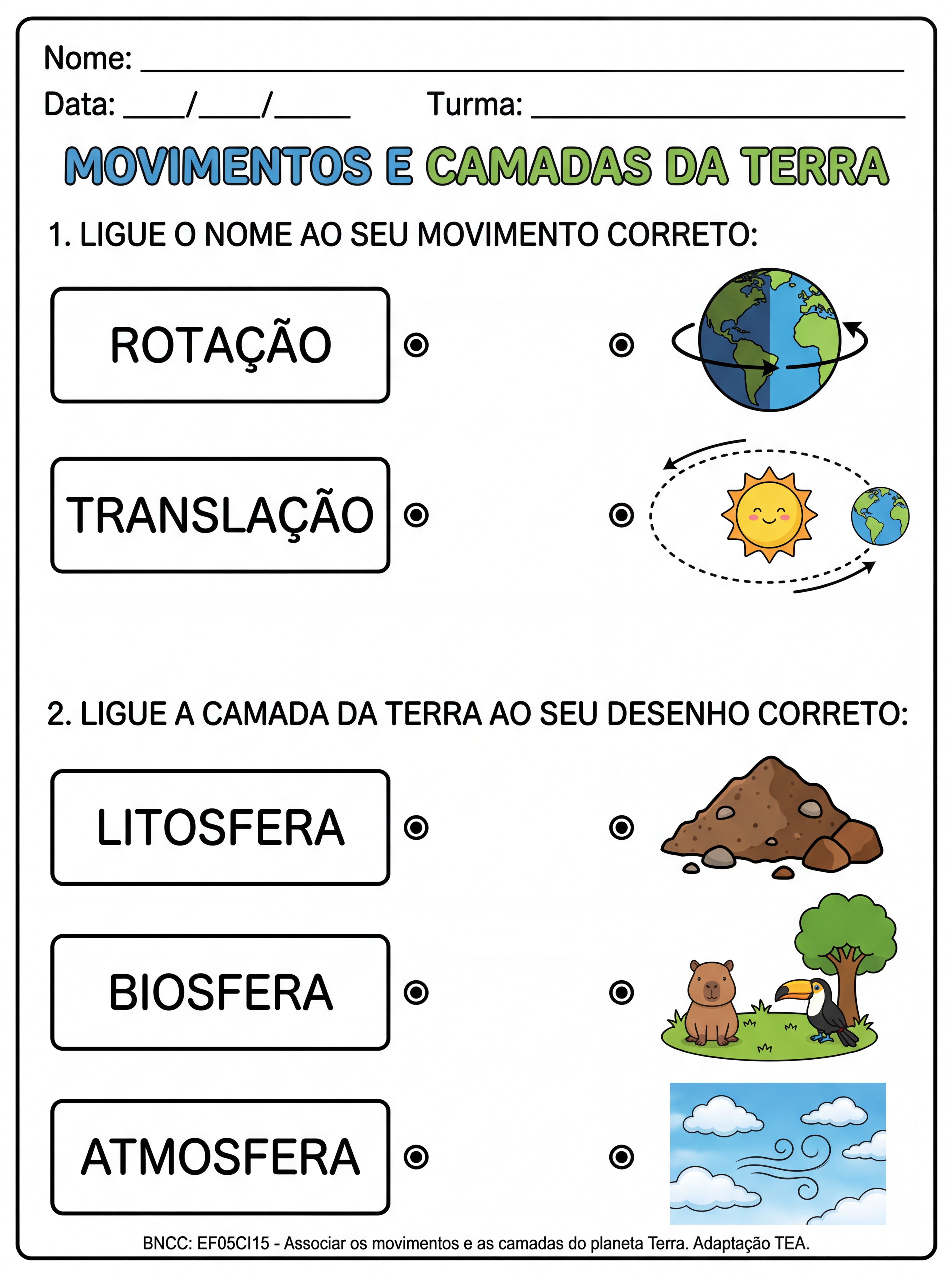 ATIVIDADE TEA 5ANO ASSOCIAR ROTAÇÃO E TRANSLAÇÃO LITOSFERA, BIOSFERA E ATMOSFERA