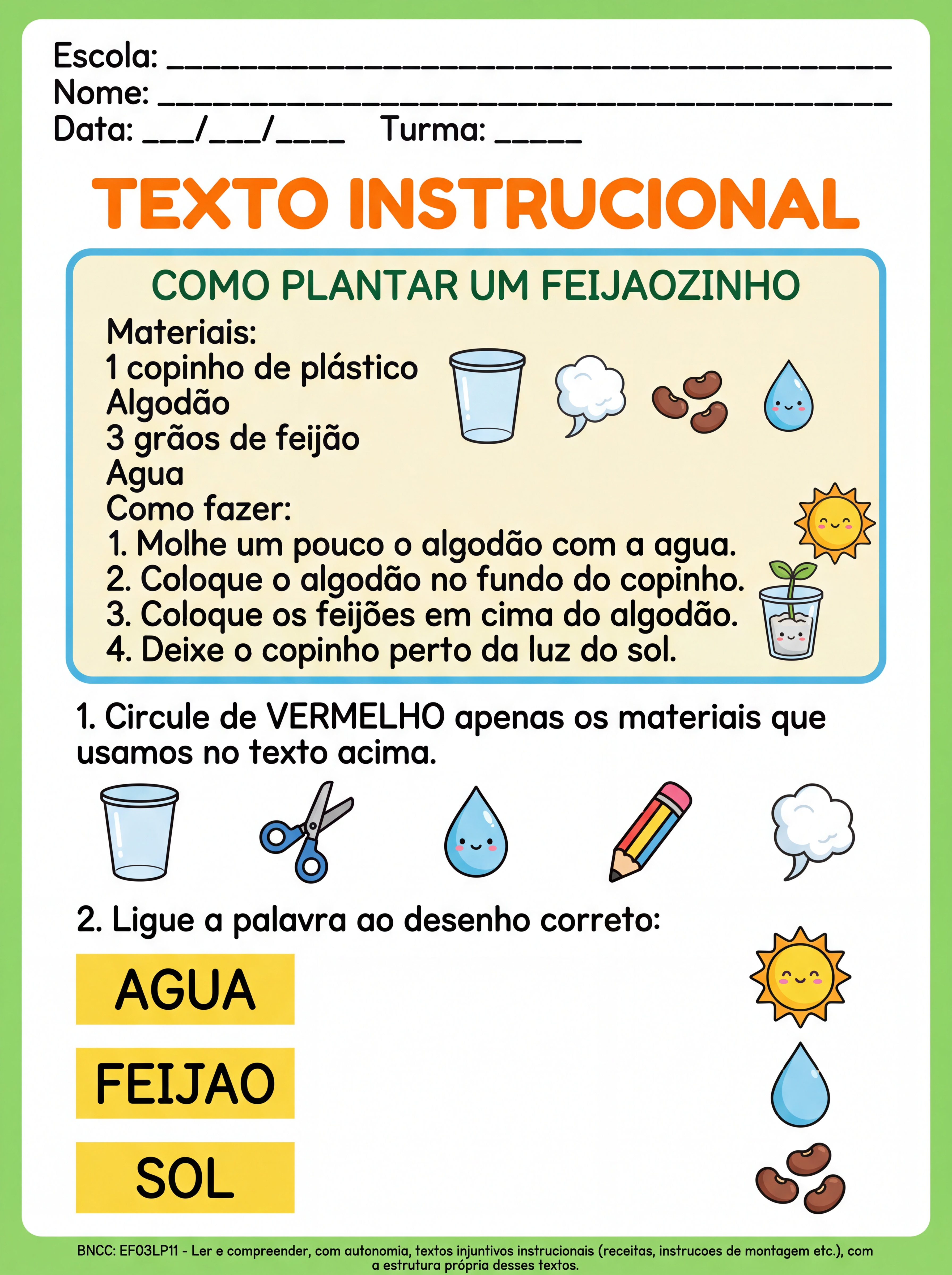 Atividade texto instrucional para terceiro ano para alunos com dificuldade