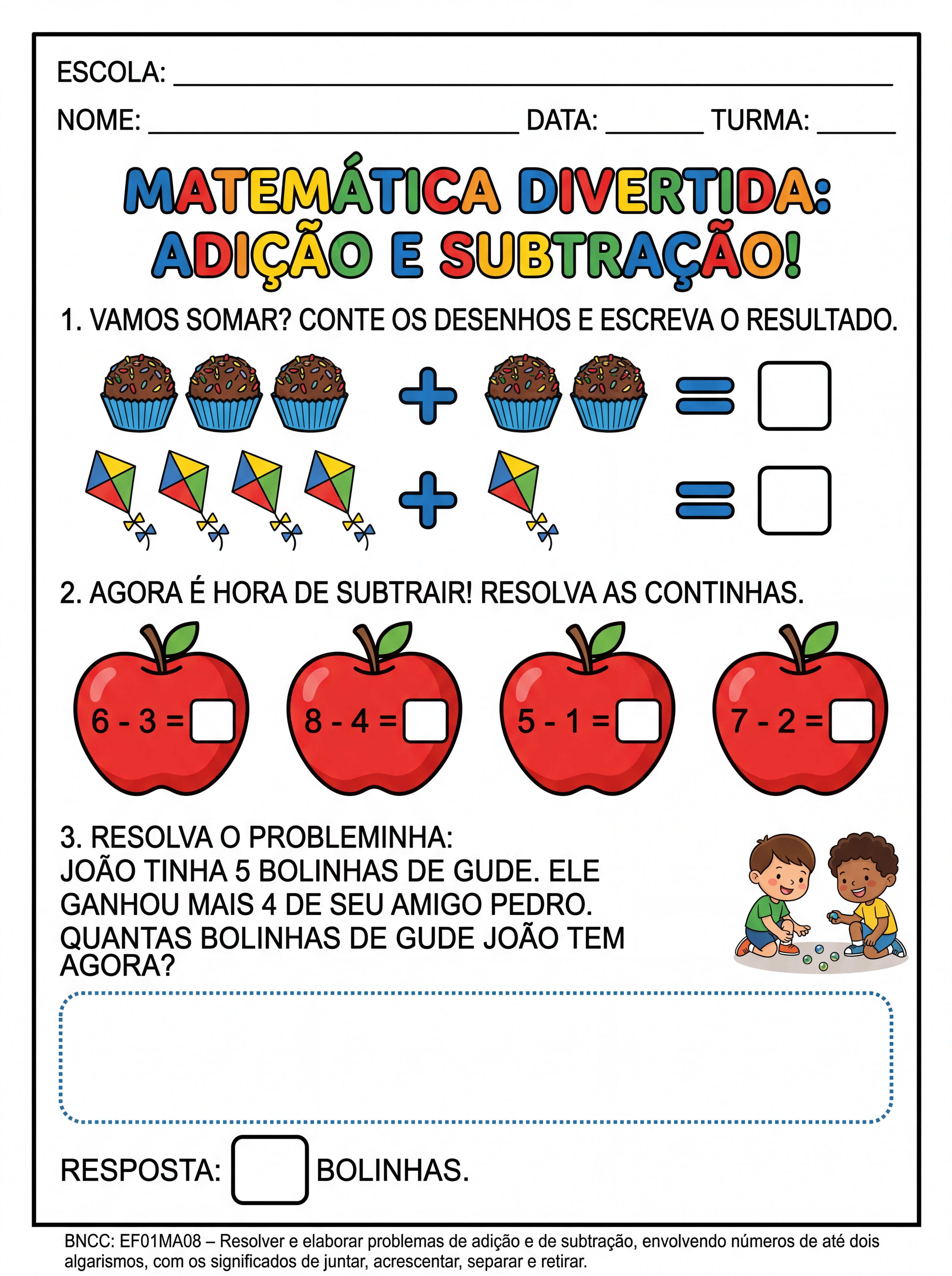 Atividade: ATIVIDADES DE CONTINHAS DE ADIÇÃO E SUBTRAÇÃO PARA ALFABETIZAÇÃO