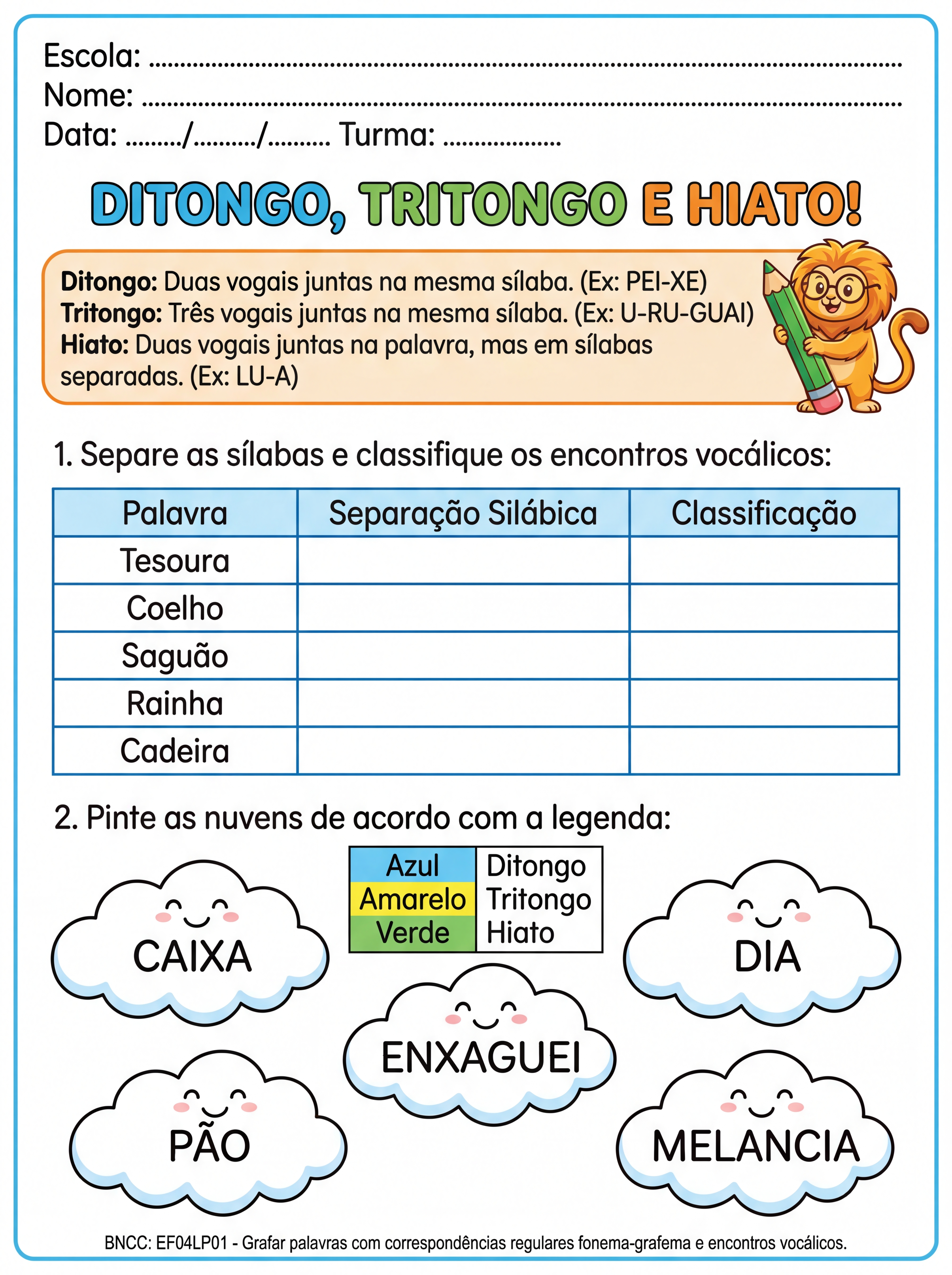 atividades sobre ditongo, tritongo e hiato