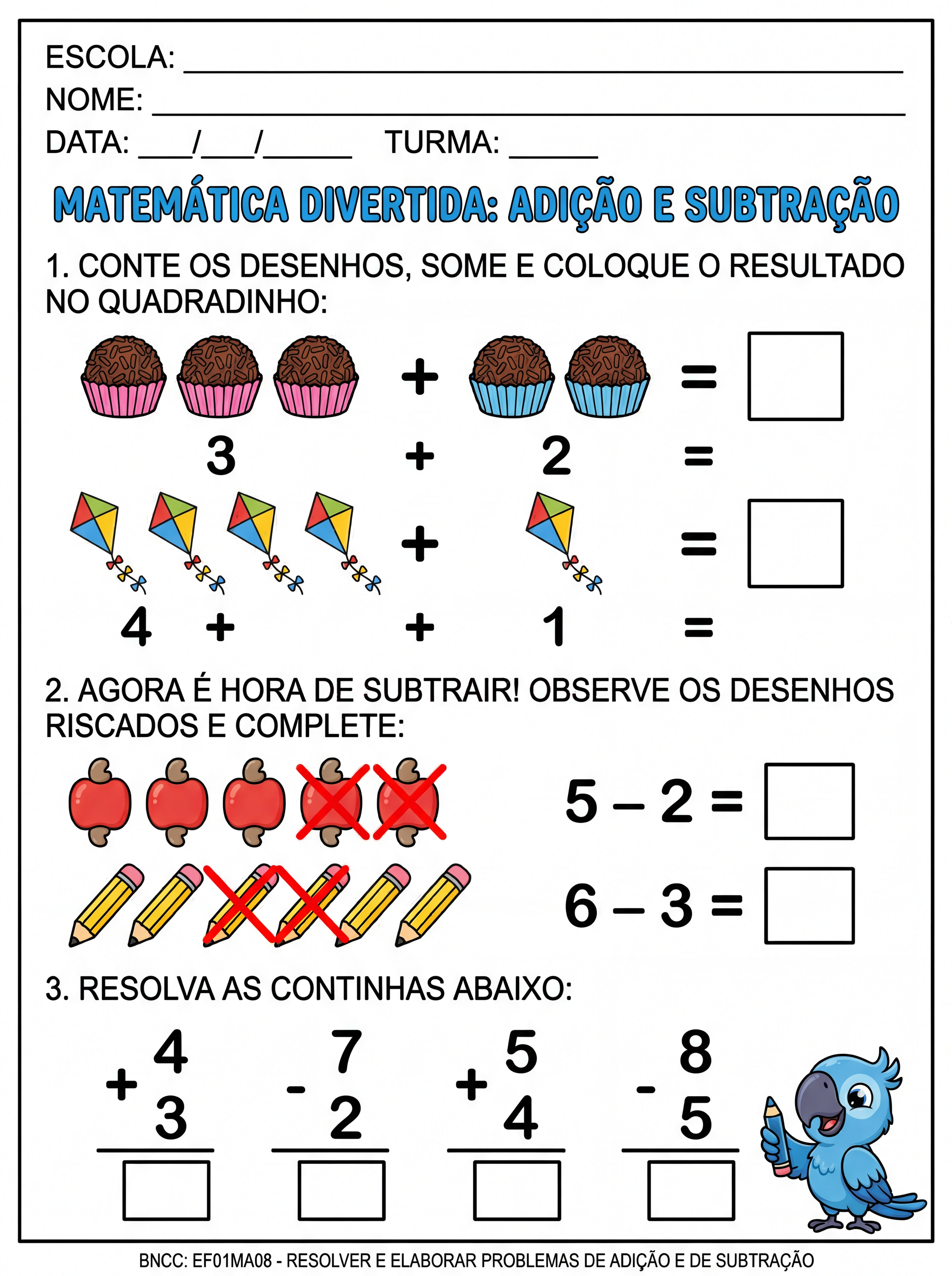 ATIVIDADES ADIÇÃO E SUBTRAÇÃO DE MATEMÁTICA PARA 1º ANO COM LETRA BASTÃO
