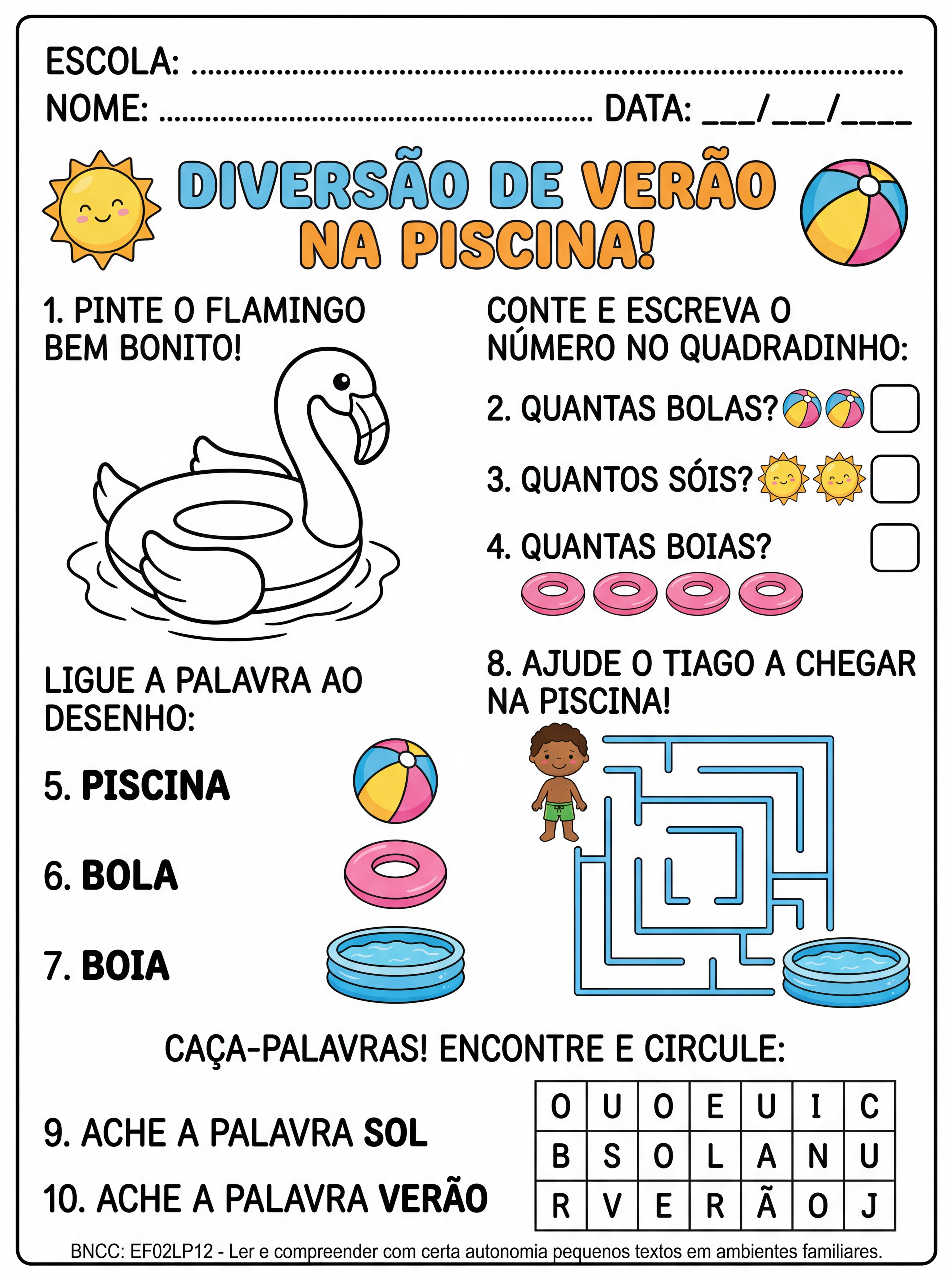Crie 10 atividades pedagógicas para crianças do 2º ano, tema piscina, verão, boia, flamingo e bola. As atividades devem ser simples, divertidas e prontas para impressão. Inclua: ligar, contar, pintar, labirinto e caça-palavras. Use linguagem infantil e frases curtas.