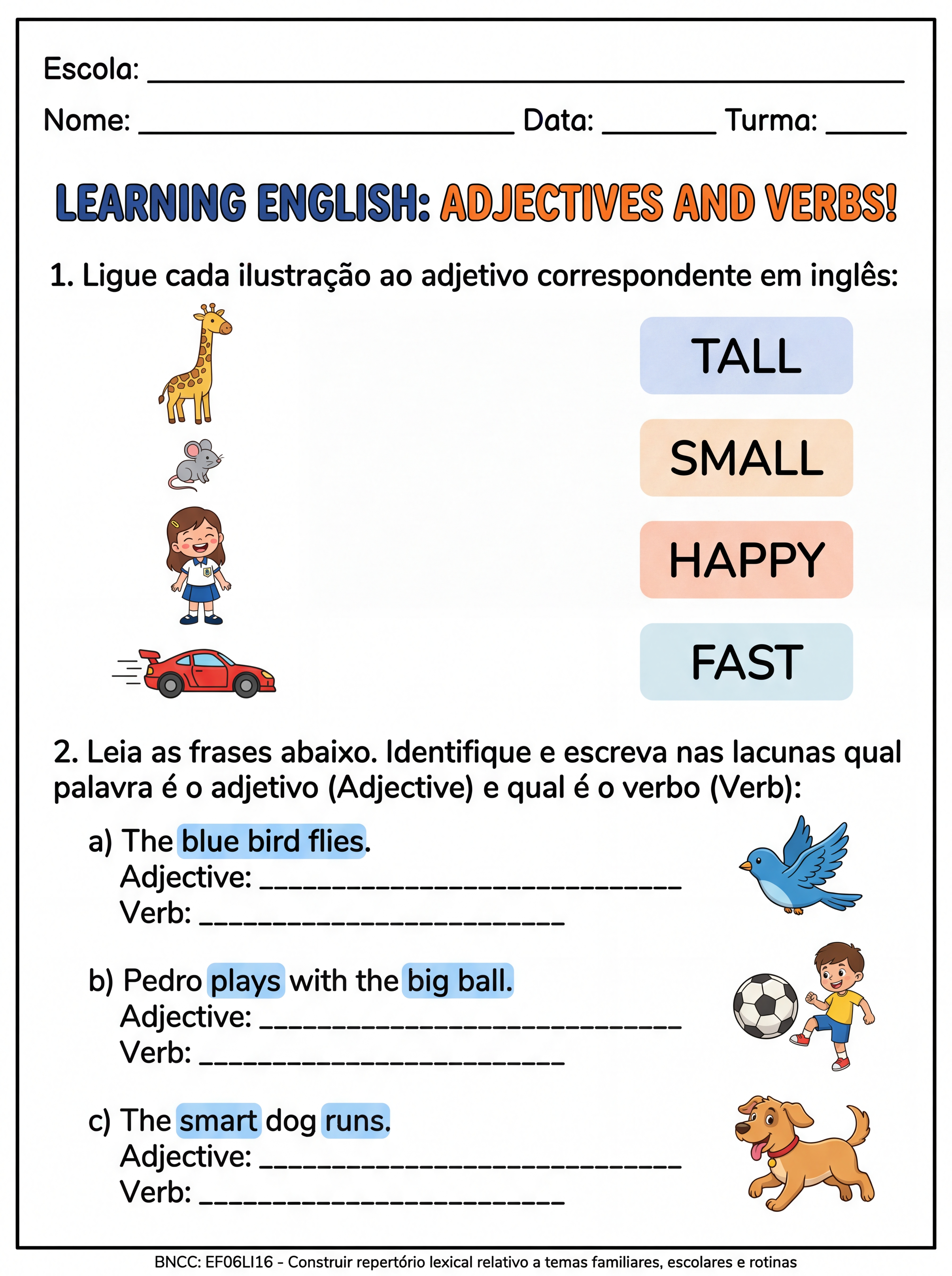 Crie 8 atividades com imagens sobre os vrbos de acao em inglês mais usados