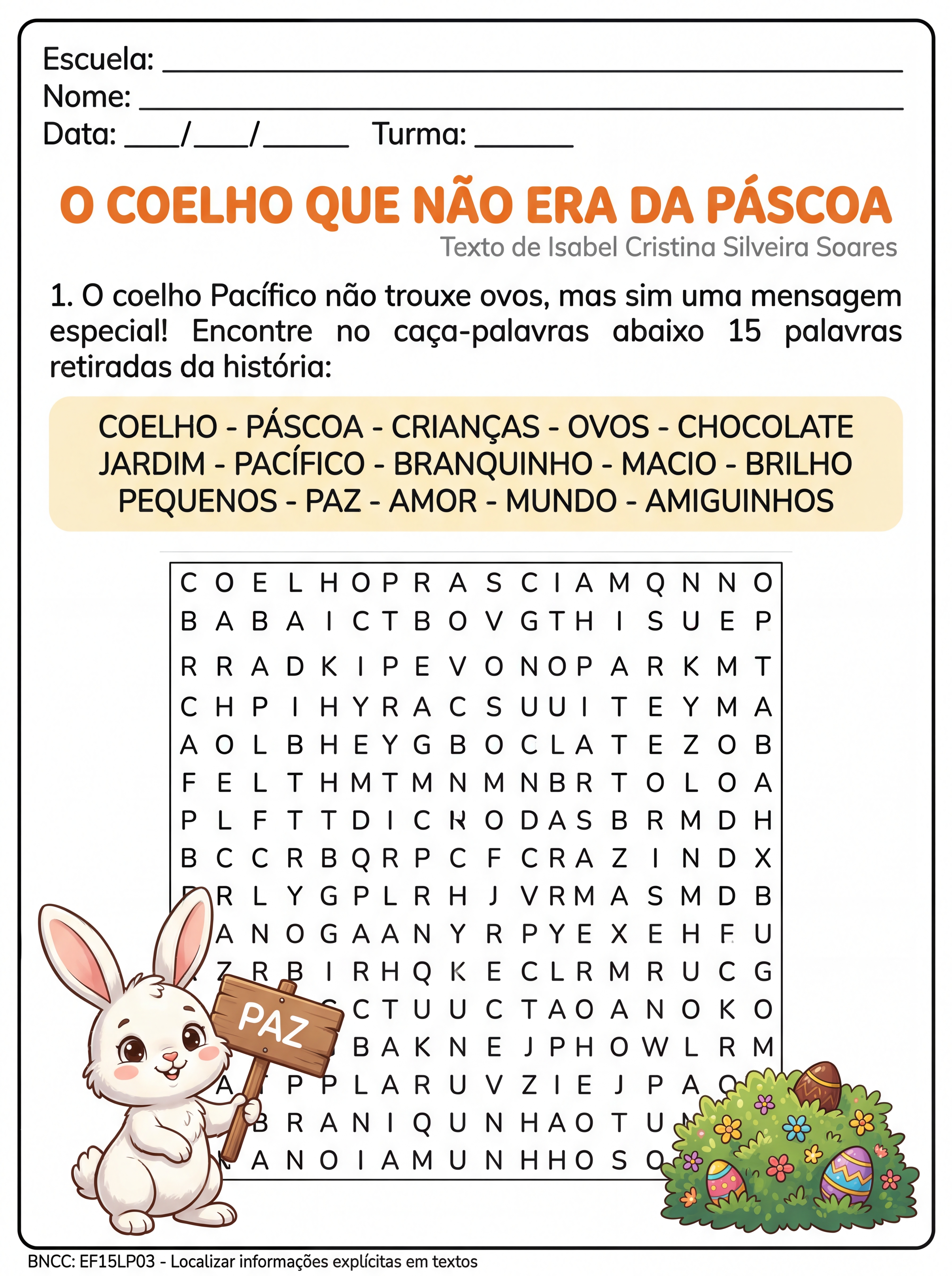 crie um caça palavras com do texto o coelho que não era da pascoa de isabel cristina silveira soares com 15 palavras para o 3º ano