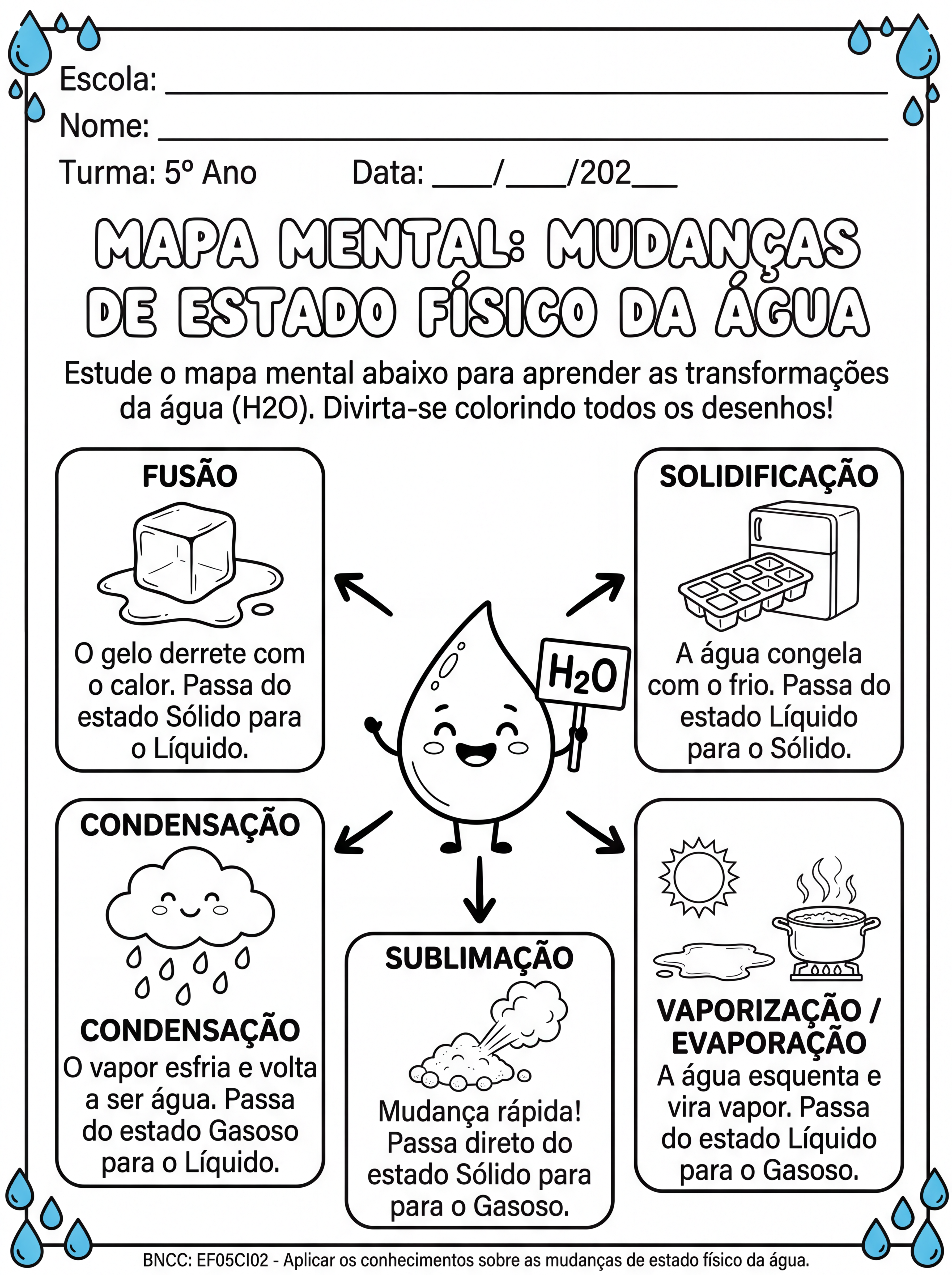 Crie um mapa mental em forma de imagem para um aluno de 5 ano de forma simples com ilustrações em preto e branco para a criança colorir. Com informações sobre as mudanças do estado físico da água. H20 Solidificação Fusão Evaporação Vaporização Condensação Sublimação
