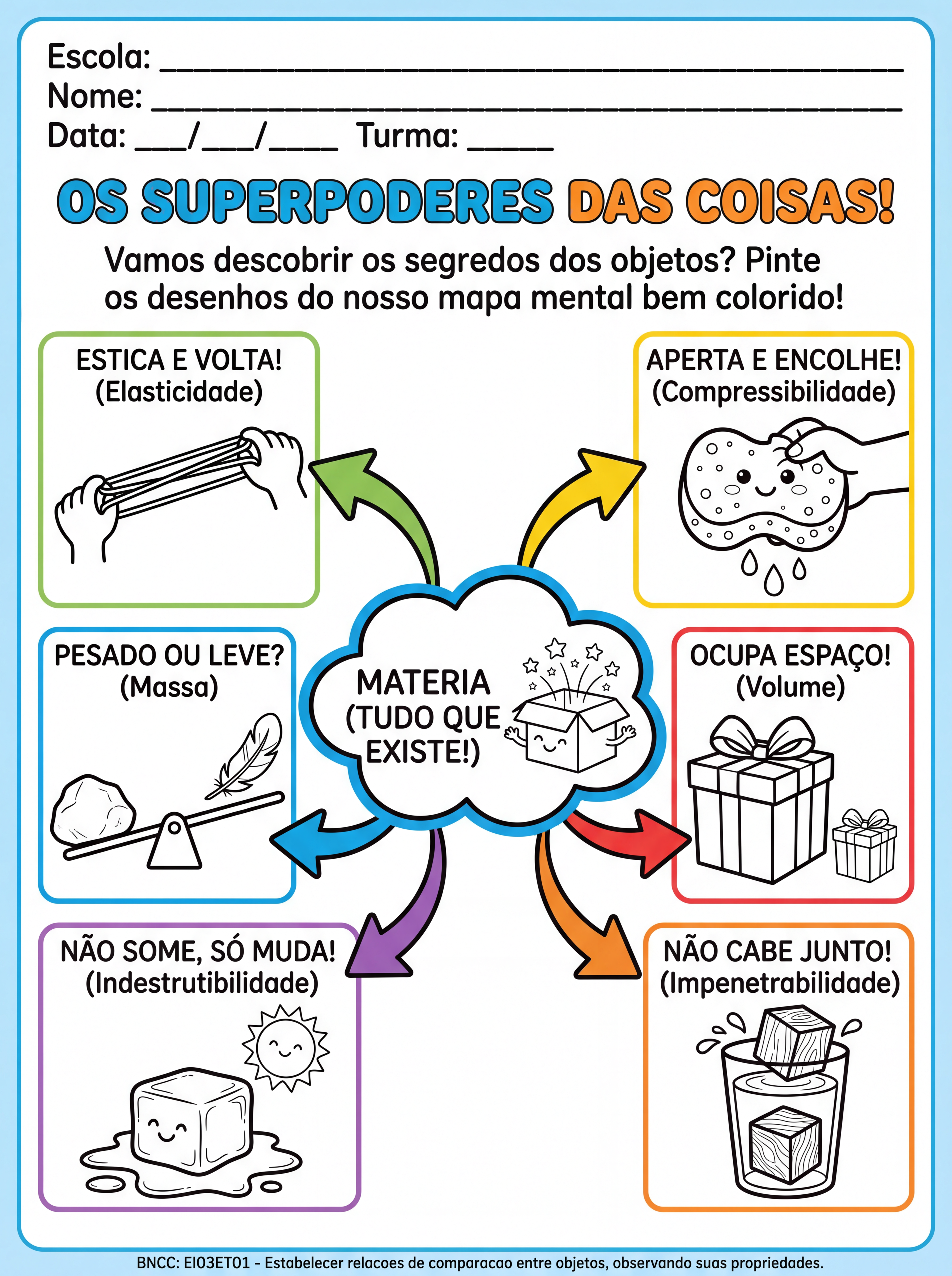 Crie um mapa mental para criança de 5 anos com linguagem adaptada sobre as propriedades da matéria. Indestrutibilidade, elasticidade, compressibilidade, volume, massa e impenetrabilidade A atividade precisa ser em preto e branco para impressão e para a criança colorir