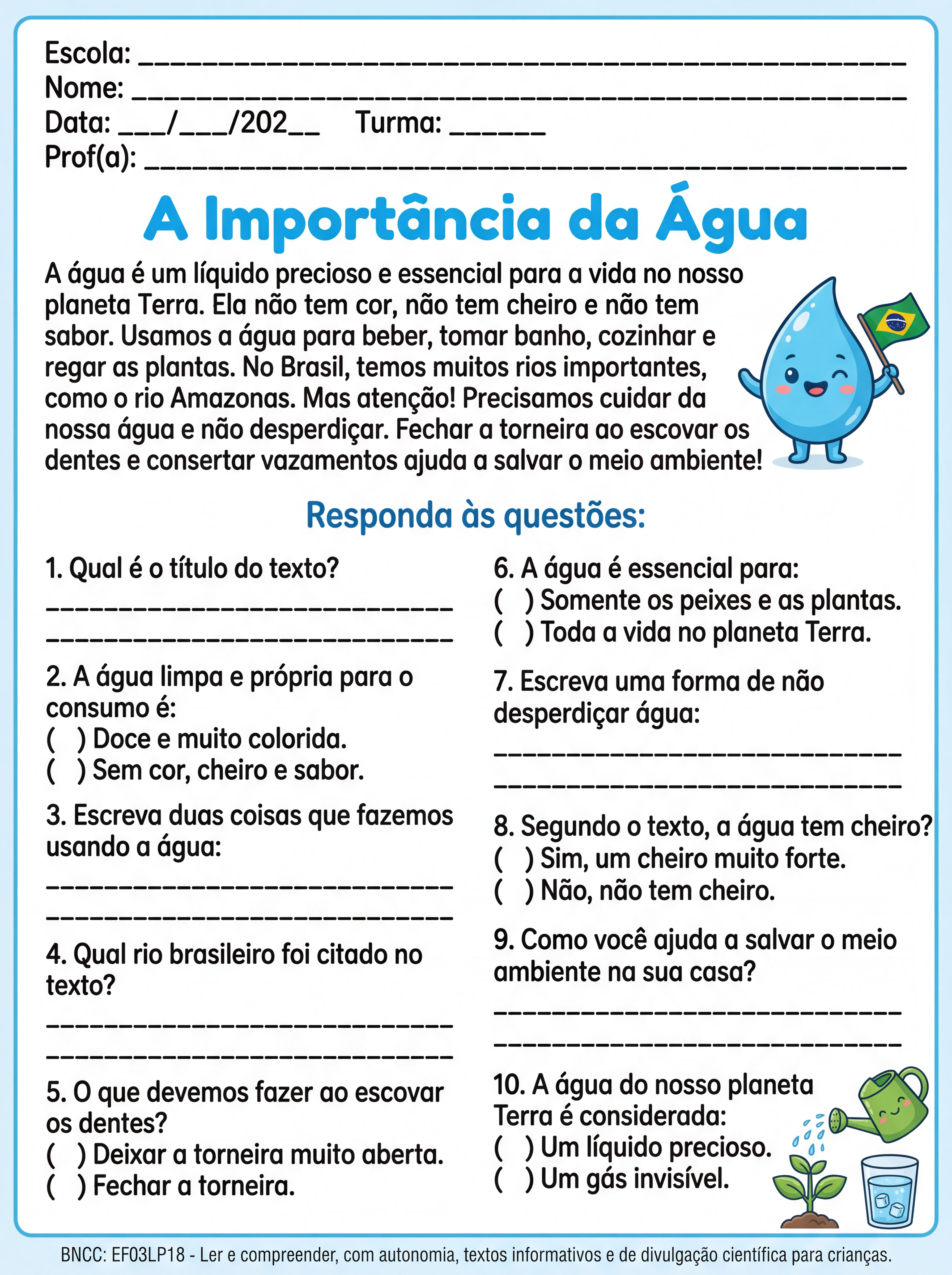Atividade: crie um texto informativo de portugues sobre a agua para 3º ano com 10 questoes de multipla escolha e abertas