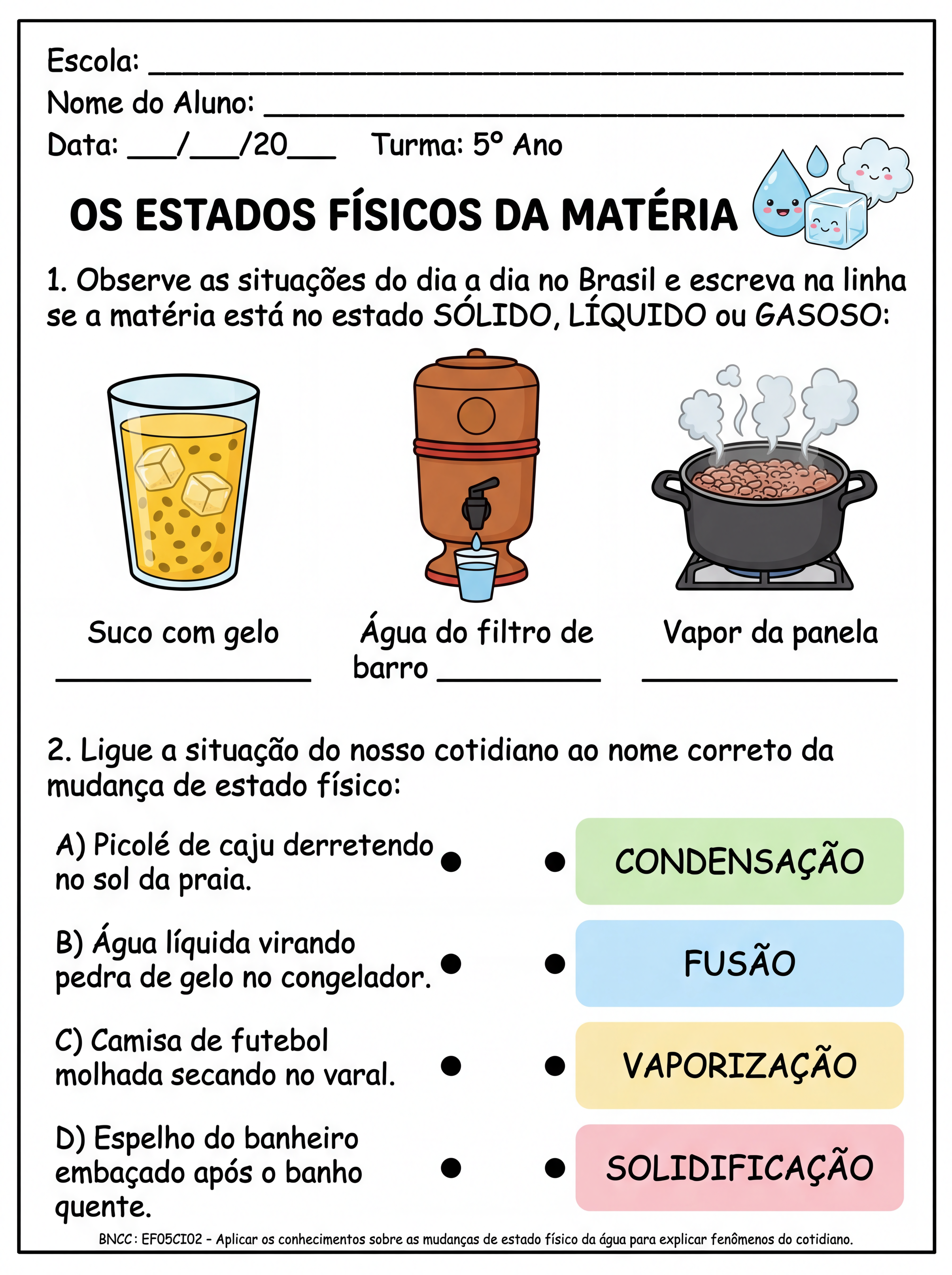 Crie uma atividade adaptada para alunos de 5ano sobre o estado físico da matéria