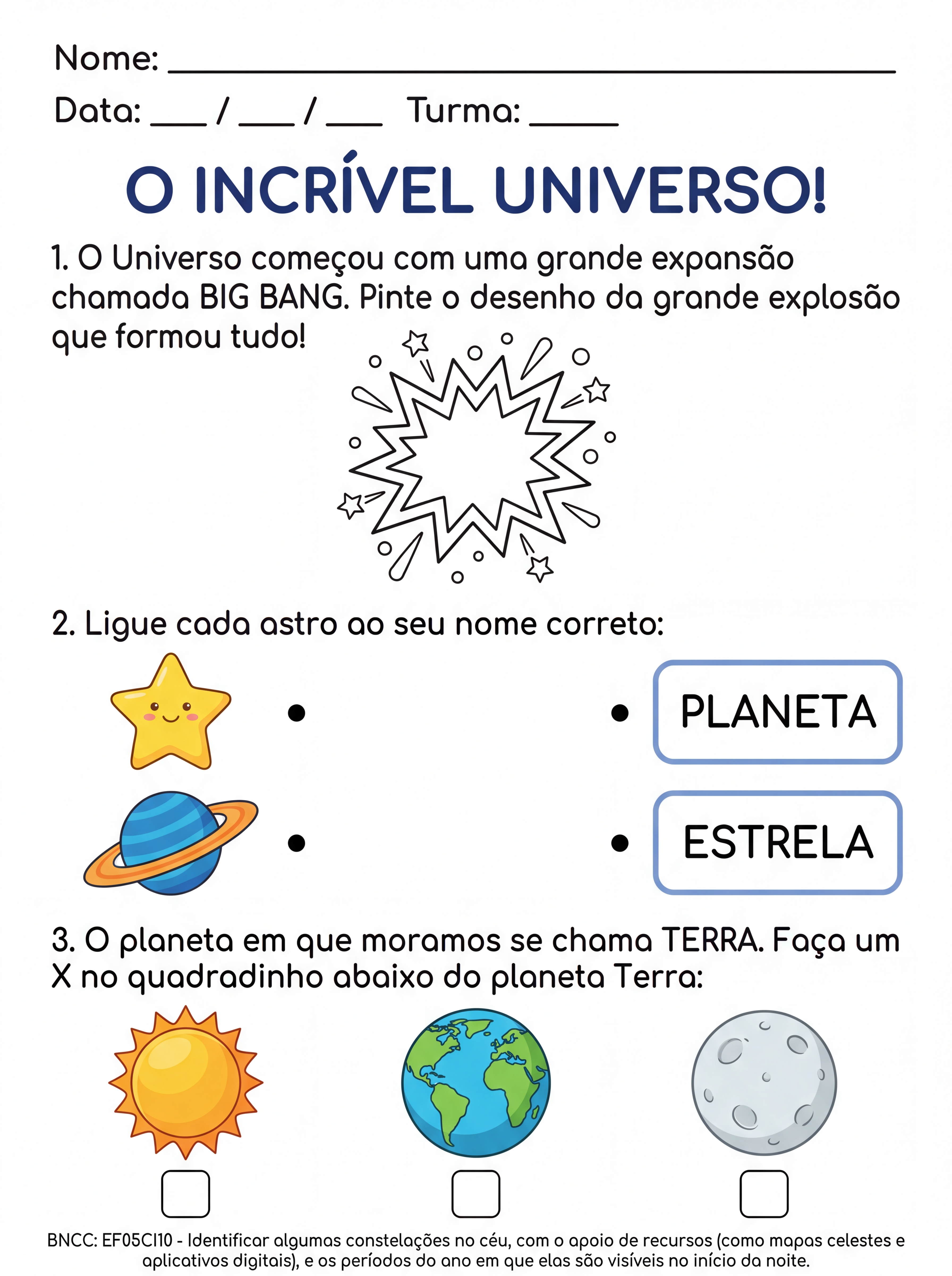 crie uma atividade adaptada para tea 5 ano sobre astros, estrelas, planetas e o big bang