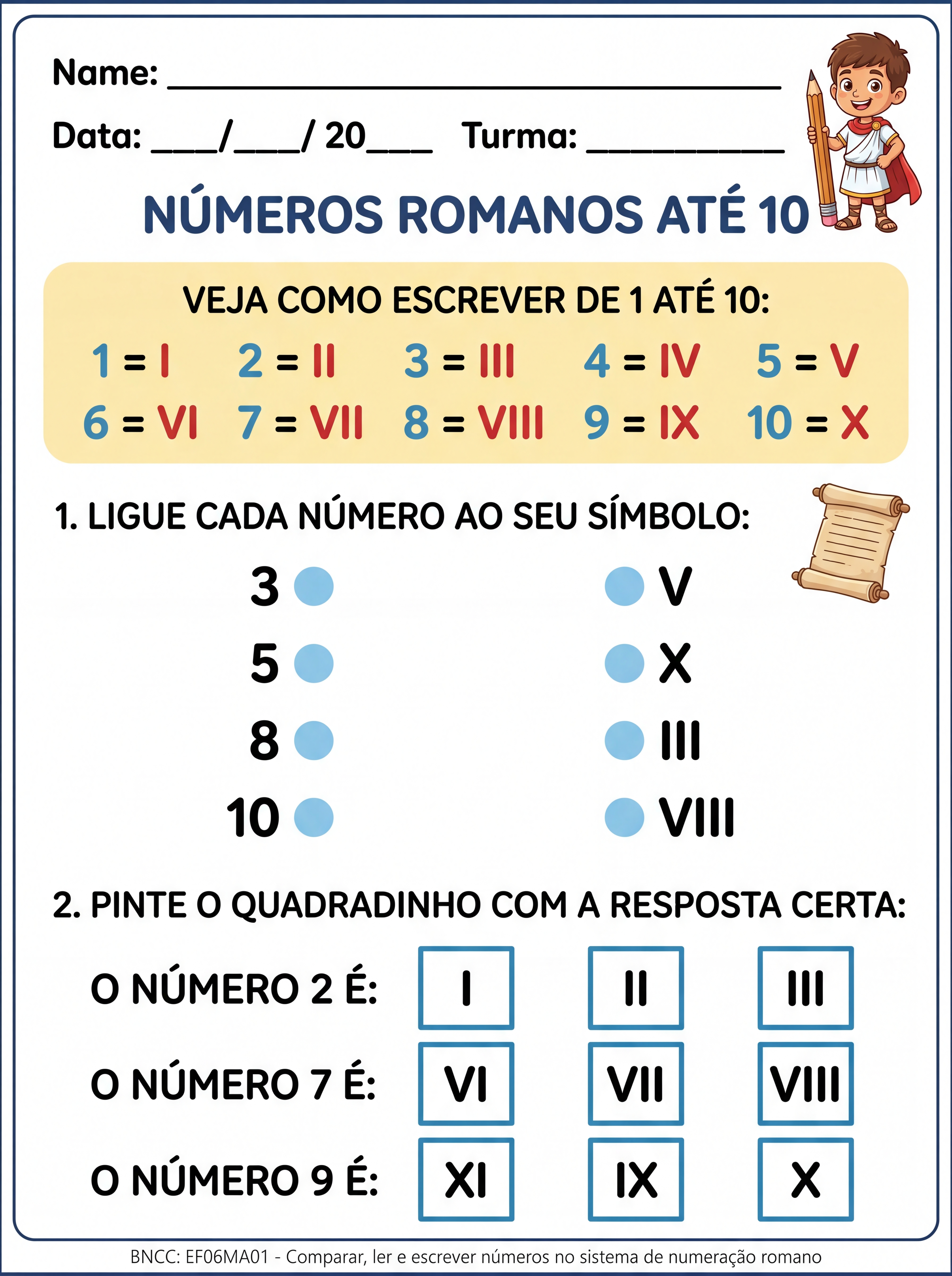 crie uma atividade adaptada para um aluno tea, 5ano sobre numeros romanos até 10. reveja a proposta antes do envio e corrija se necessário