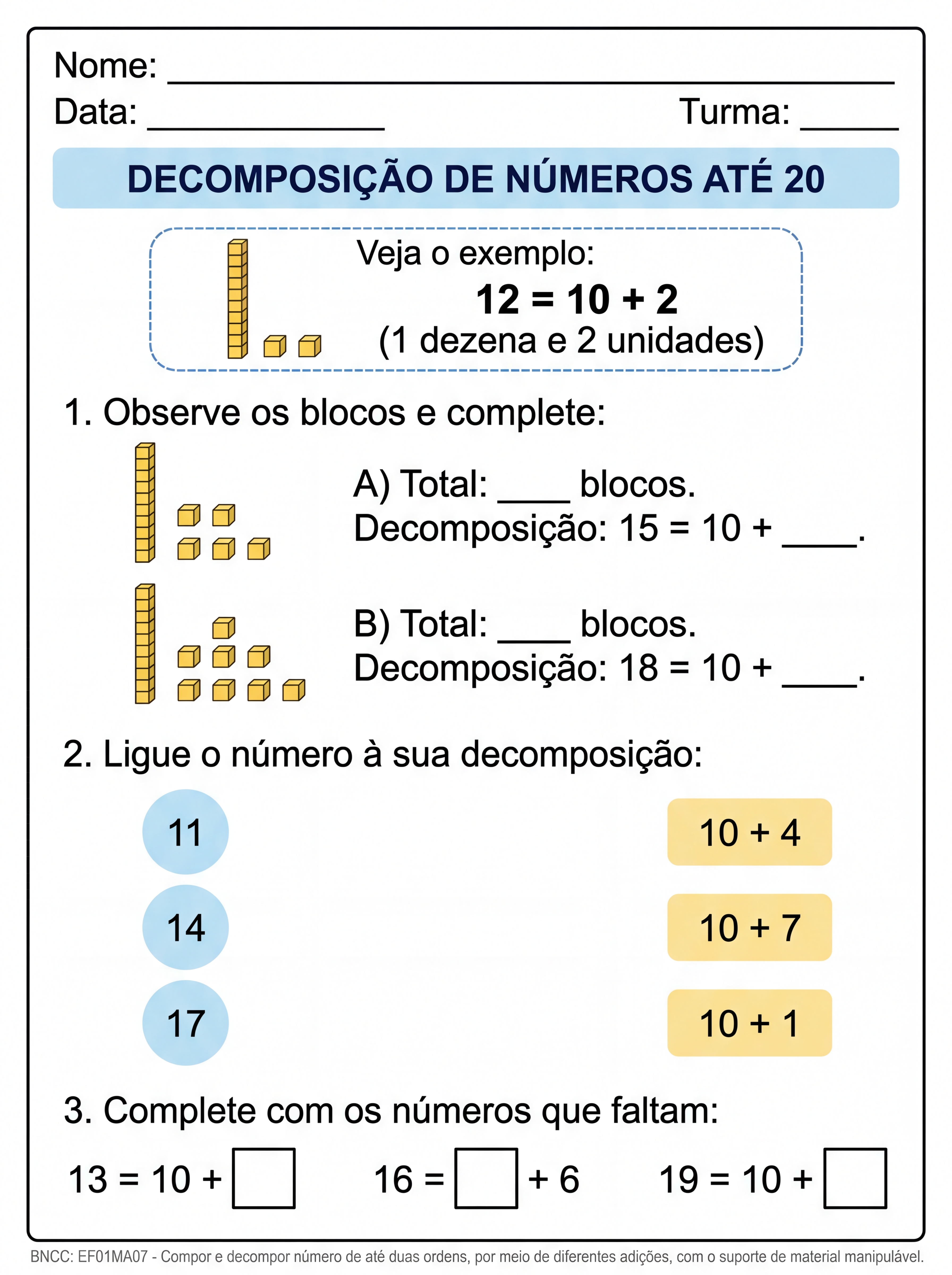 Atividade: CRIE UMA ATIVIDADE ADAPTADA TEA PARA 5ANO SOBRE decomposição  dos numerais até 20