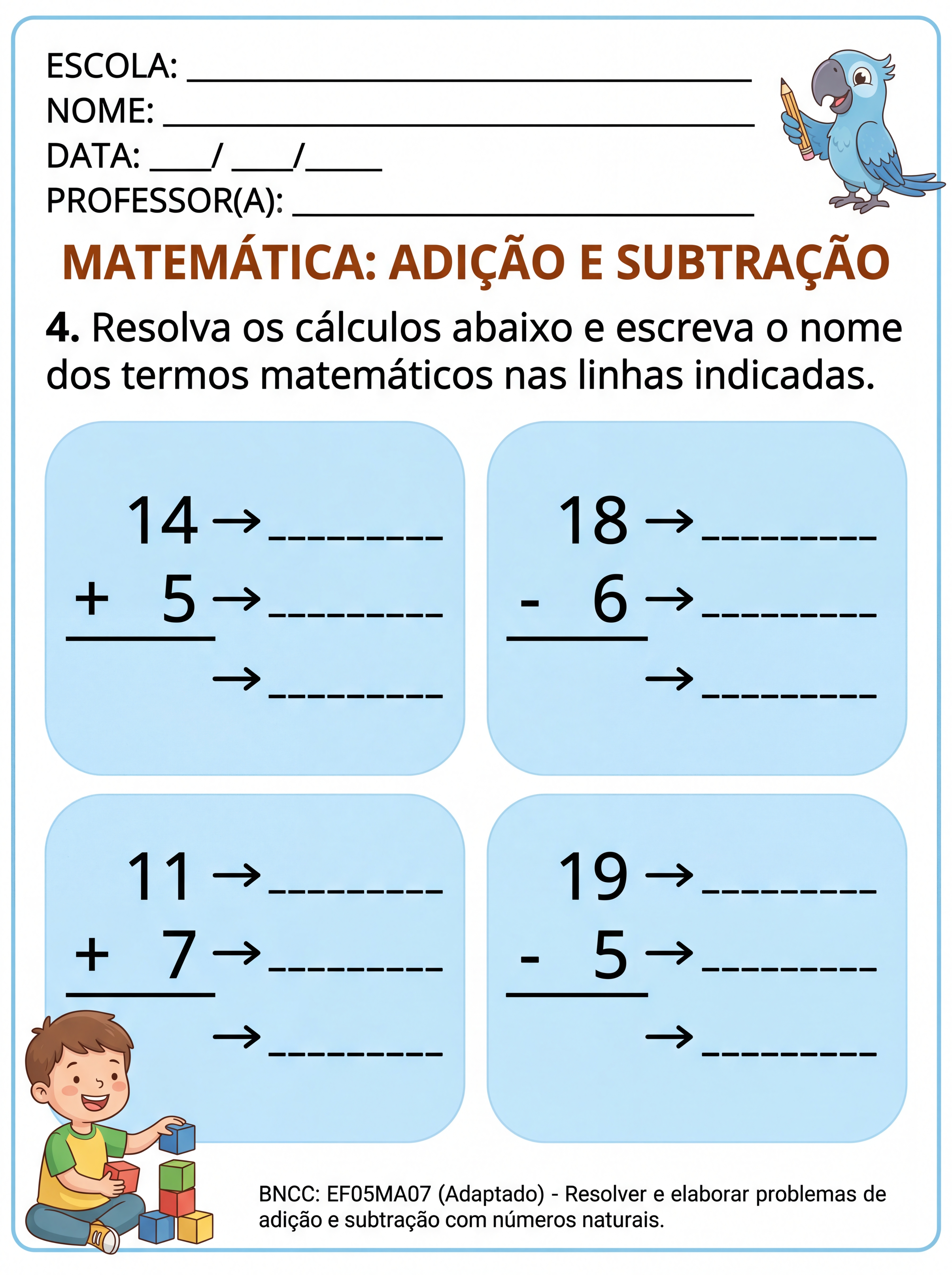 Atividade: CRIE UMA ATIVIDADE ADAPTADA TEA PARA 5ANO SOBRE  adição e subtração sem reagrupamento até 20, uma atividade com 4 cálculos  para efetuar e escrever o nome dos termos . Enumere a atividade comecando pelo número 4