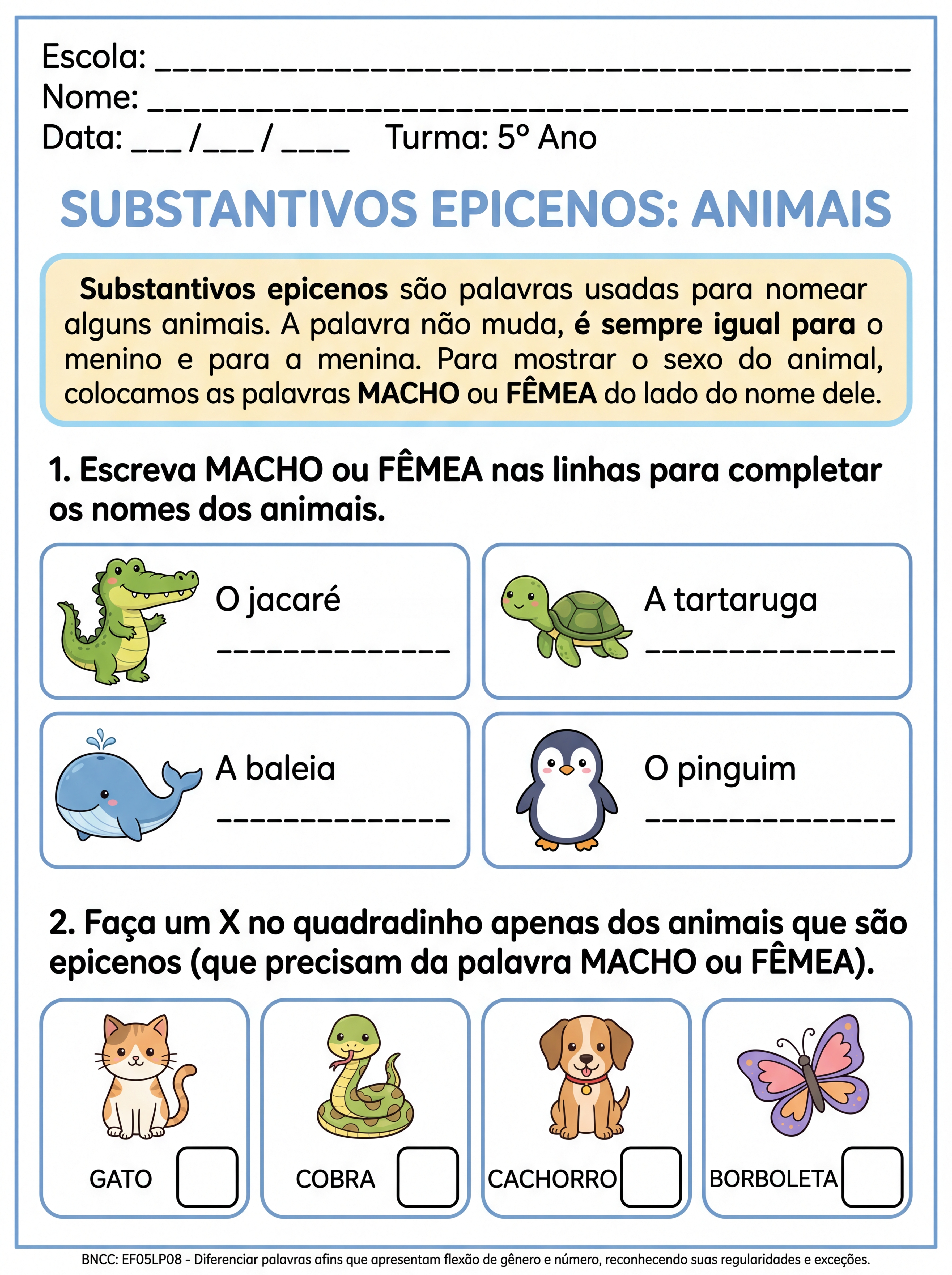 CRIE UMA ATIVIDADE ADAPTADA TEA PARA 5ANO SOBRE SUBSTANTIVO EPICENO