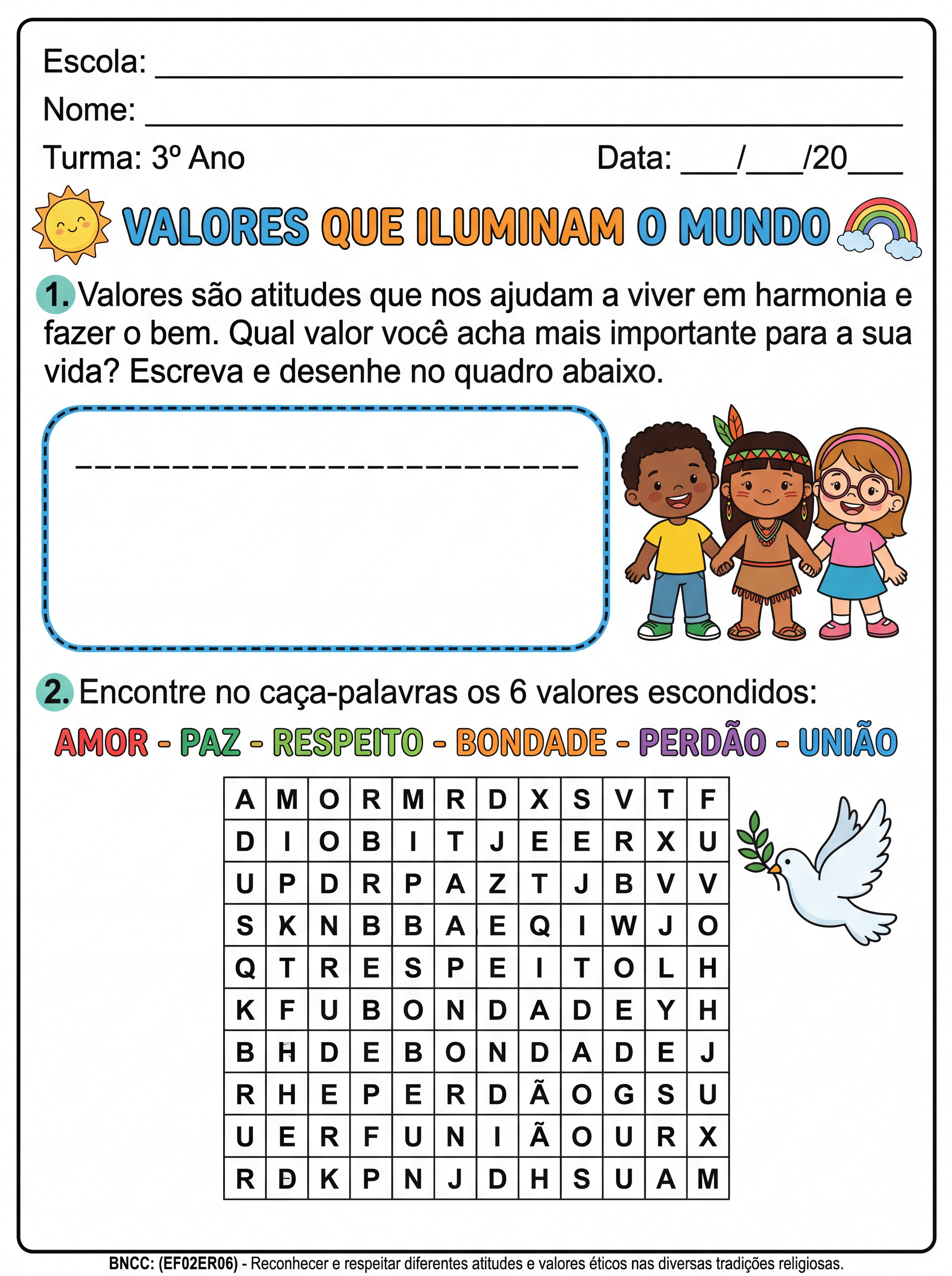 Atividade: crie uma atividade de ensino religioso sobre valores religiosos e com uma caça palavras para 3º ano