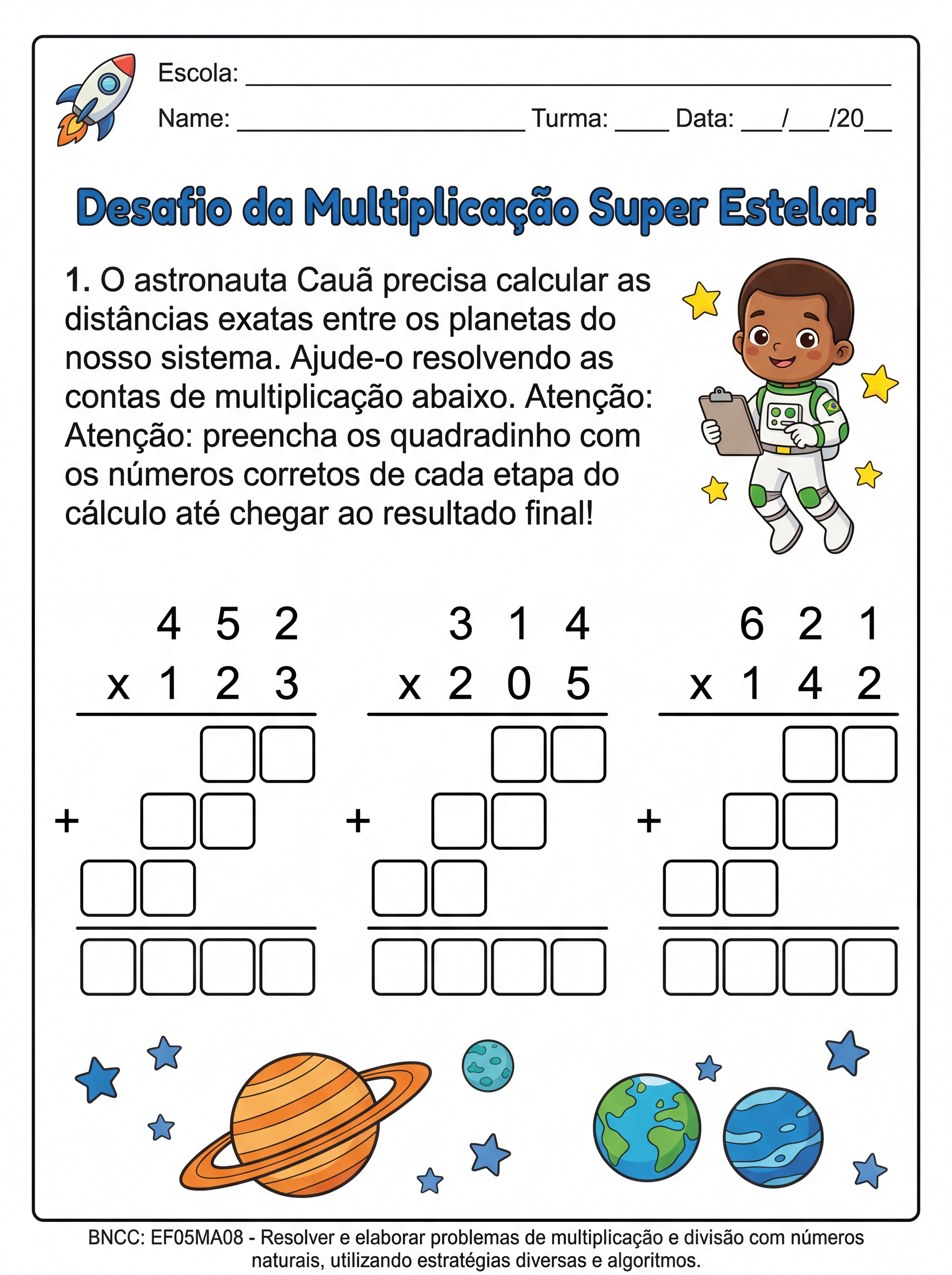 crie uma atividade de multiplicação com 3 números no multiplicador para alunos do 5º ano. Deixe as contas armadas e com lacunas em branco para o aluno preencher o cálculo.