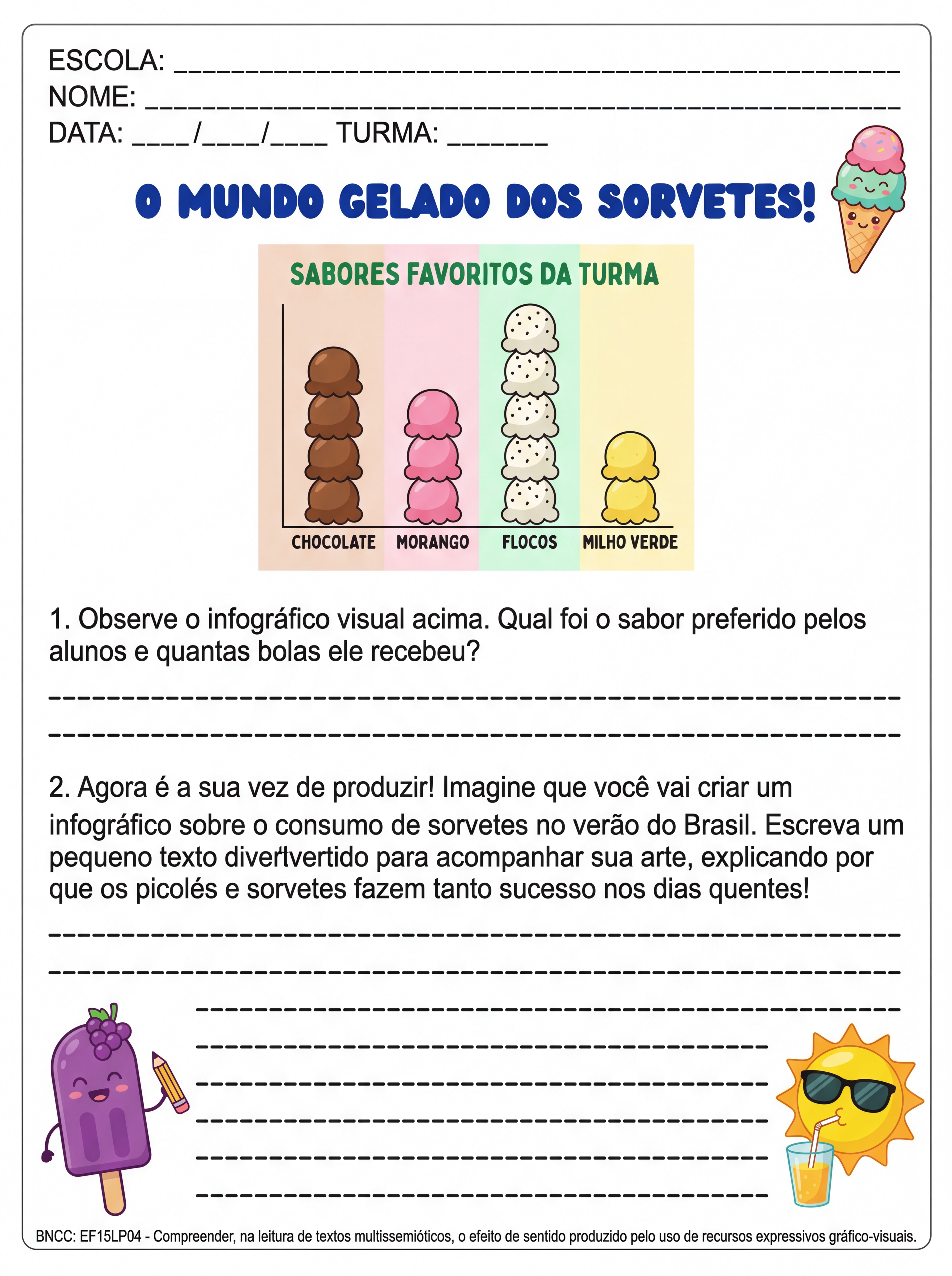 Atividade: Crie uma atividade de produção textual sobre infográfico relacionado ao consumo de sorvete para alunos do terceiro ano do fundamental.