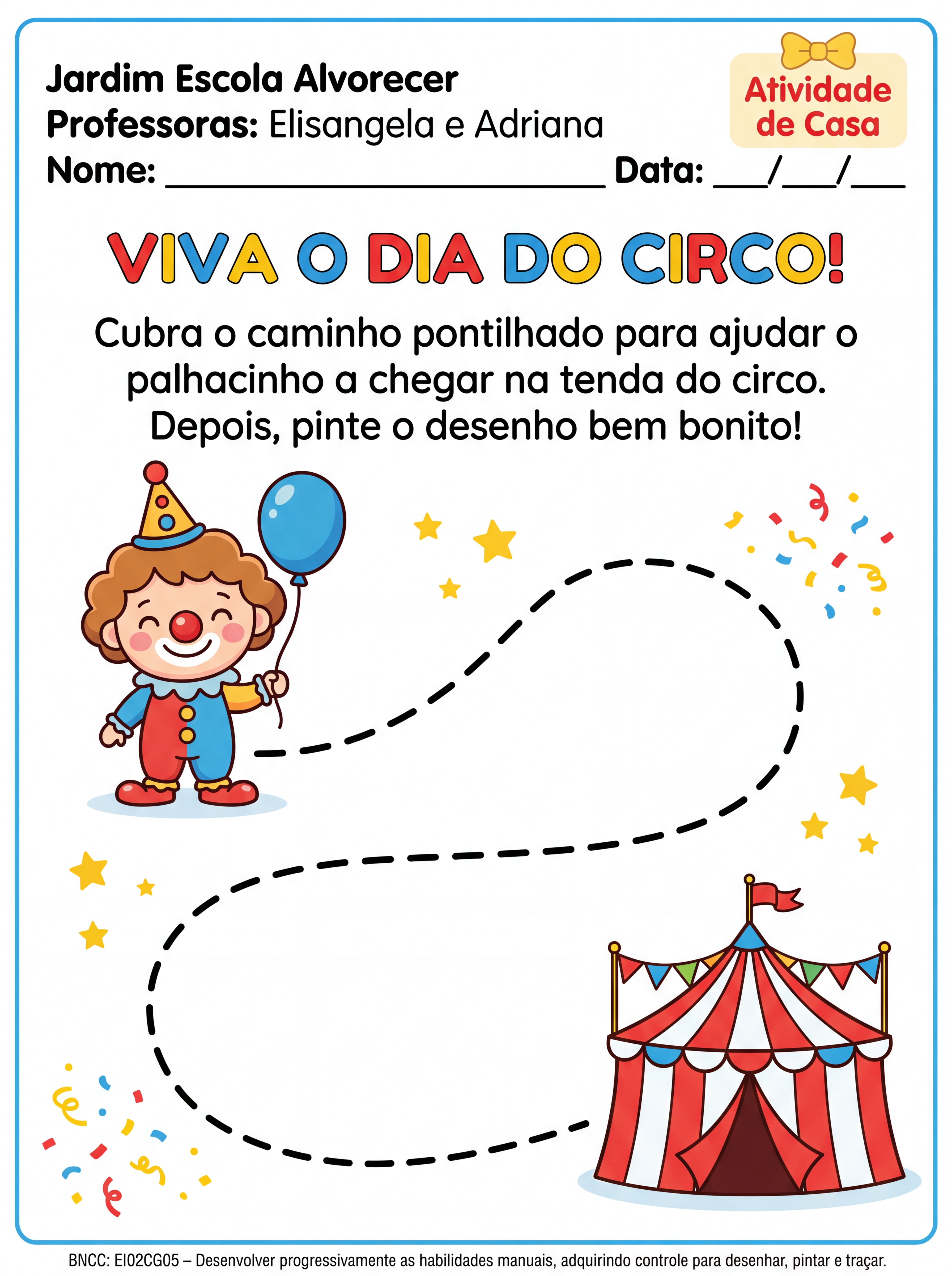 Crie uma atividade para crianças do maternal 2 e pré 1, a atividade deve conter o nome da escola : Jardim Escola Alvorecer e das professoras Elisângela e Adriana. A atividade deverá ser para casa e para trabalhar o dia do circo.