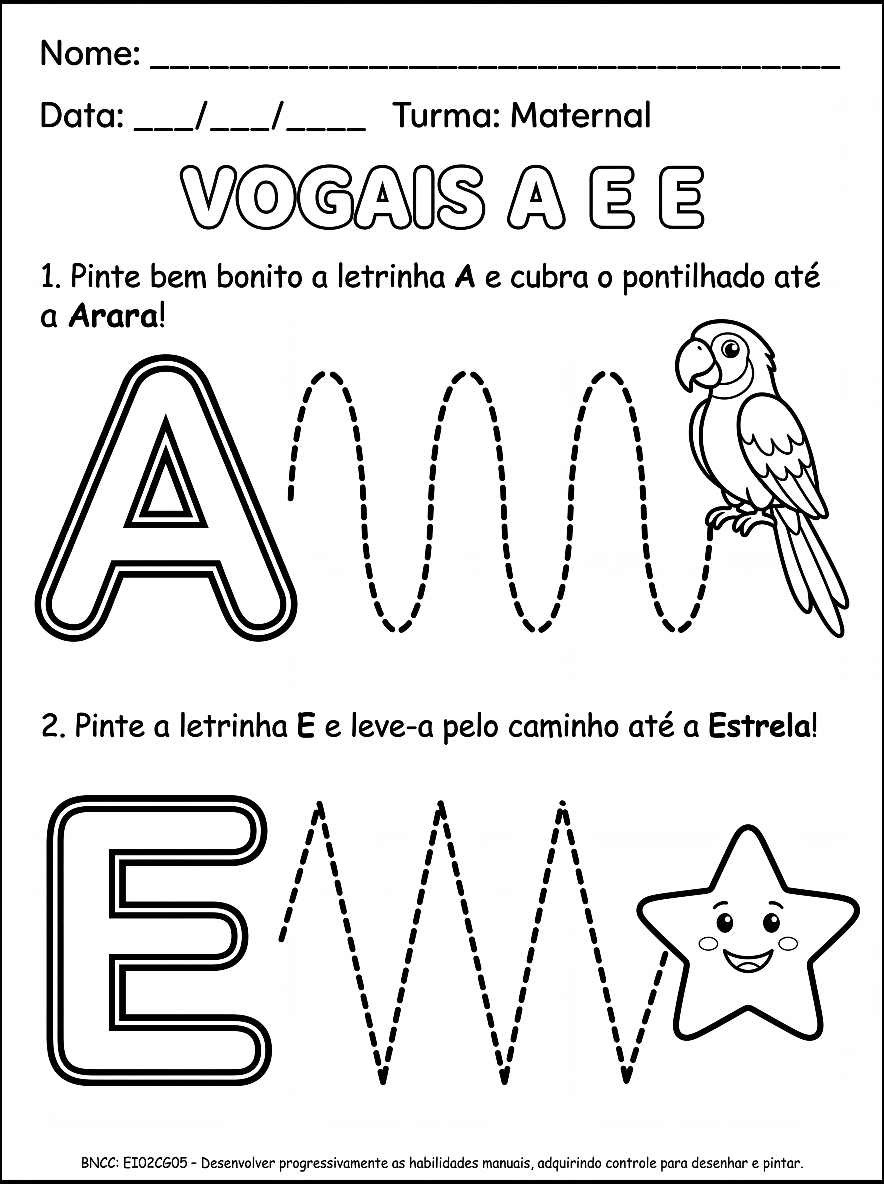 Crie uma atividade para crianças do maternal , A atividade deve conter : coordenação motora e as vogais A, E, a atividade deve ser em preto e branco para impressão e para o aluno colorir as ilustrações.