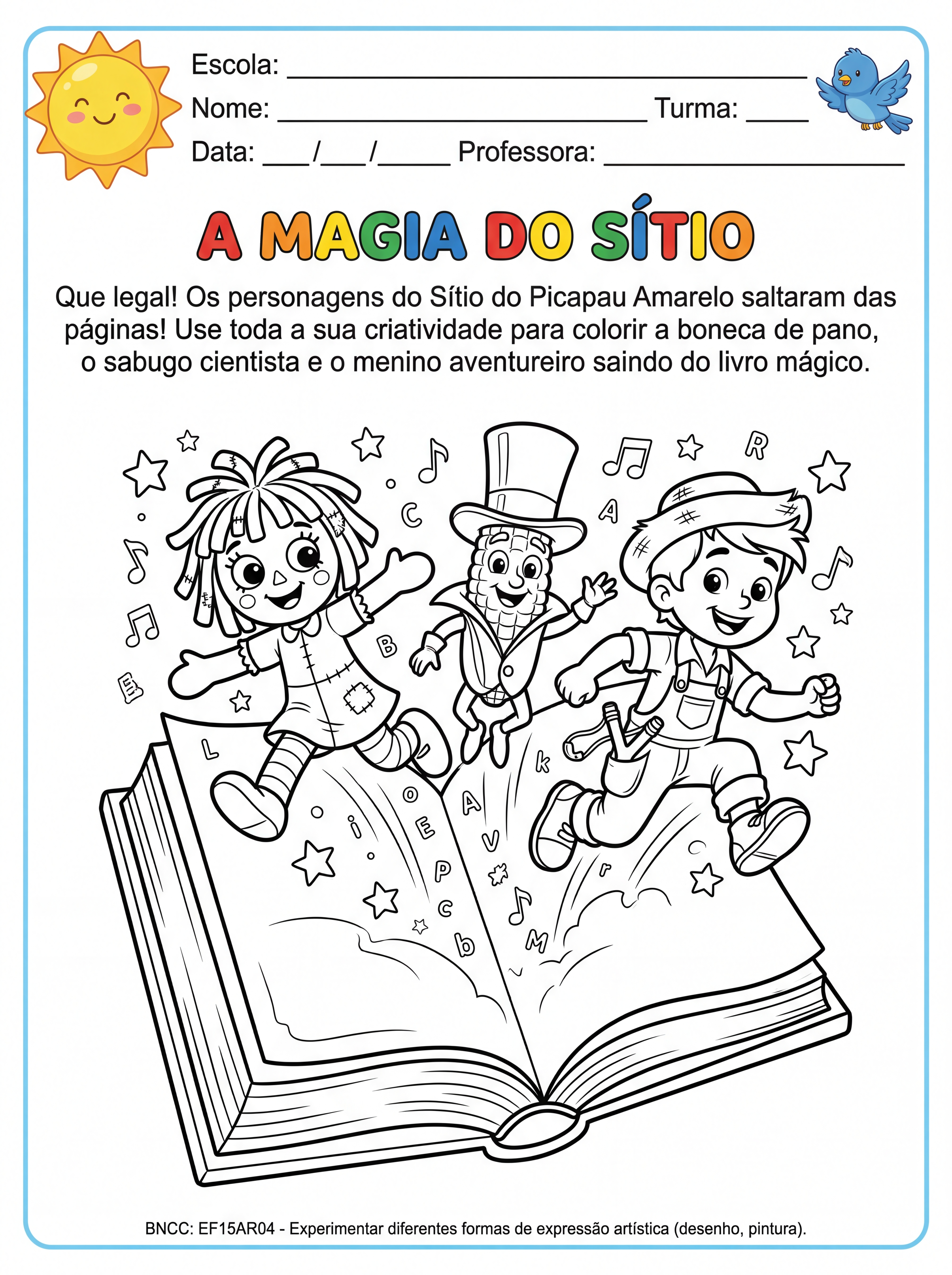 elabore um desenho para colorir com os personagens do sítio do pica pau amarelo saindo do livro