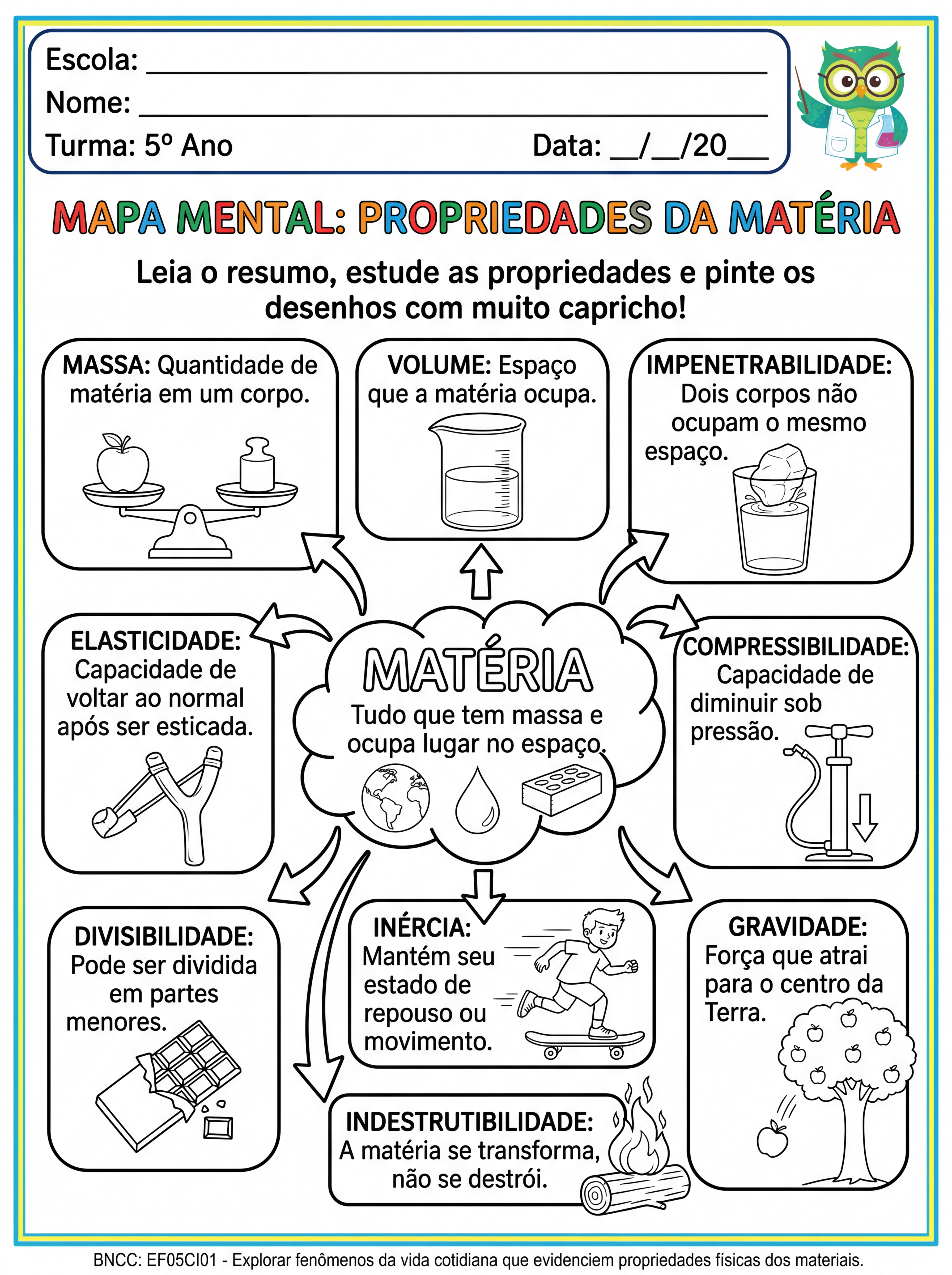 Elabore um mapa mental com imagens em preto e branco para colorir com as propriedades da matéria para uma turma de 5 ano de forma resumida. Quero que contenha informações sobre: massa, volume, matéria, compressibilidade, elasticidade, divisibilidade, indestrutibilidade, impenetrabilidade, gravidade e inércia