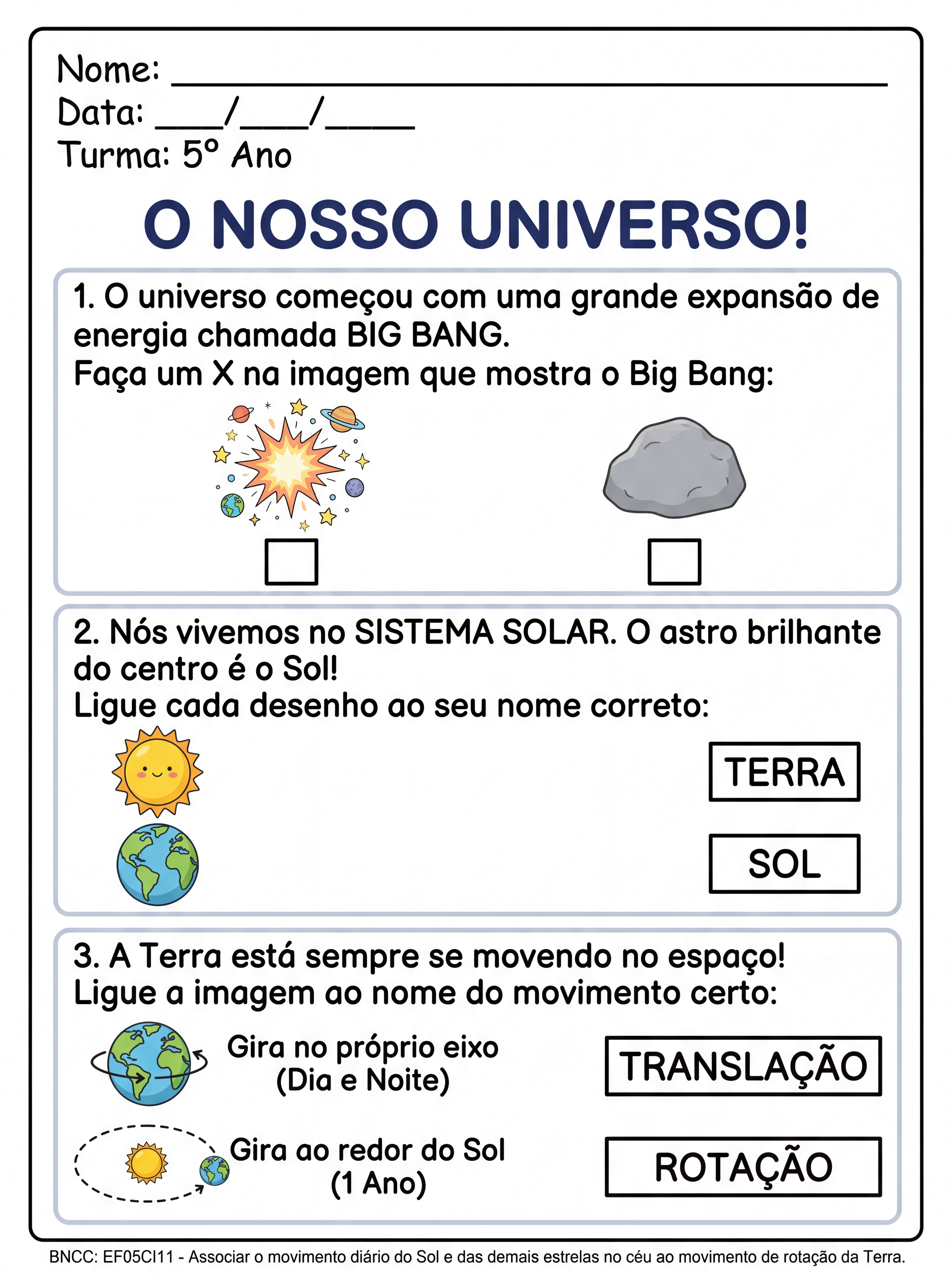elabore uma atividade adaptada para TEA 5 ANO, abordando : big bang, sistema solar, rotação e translação