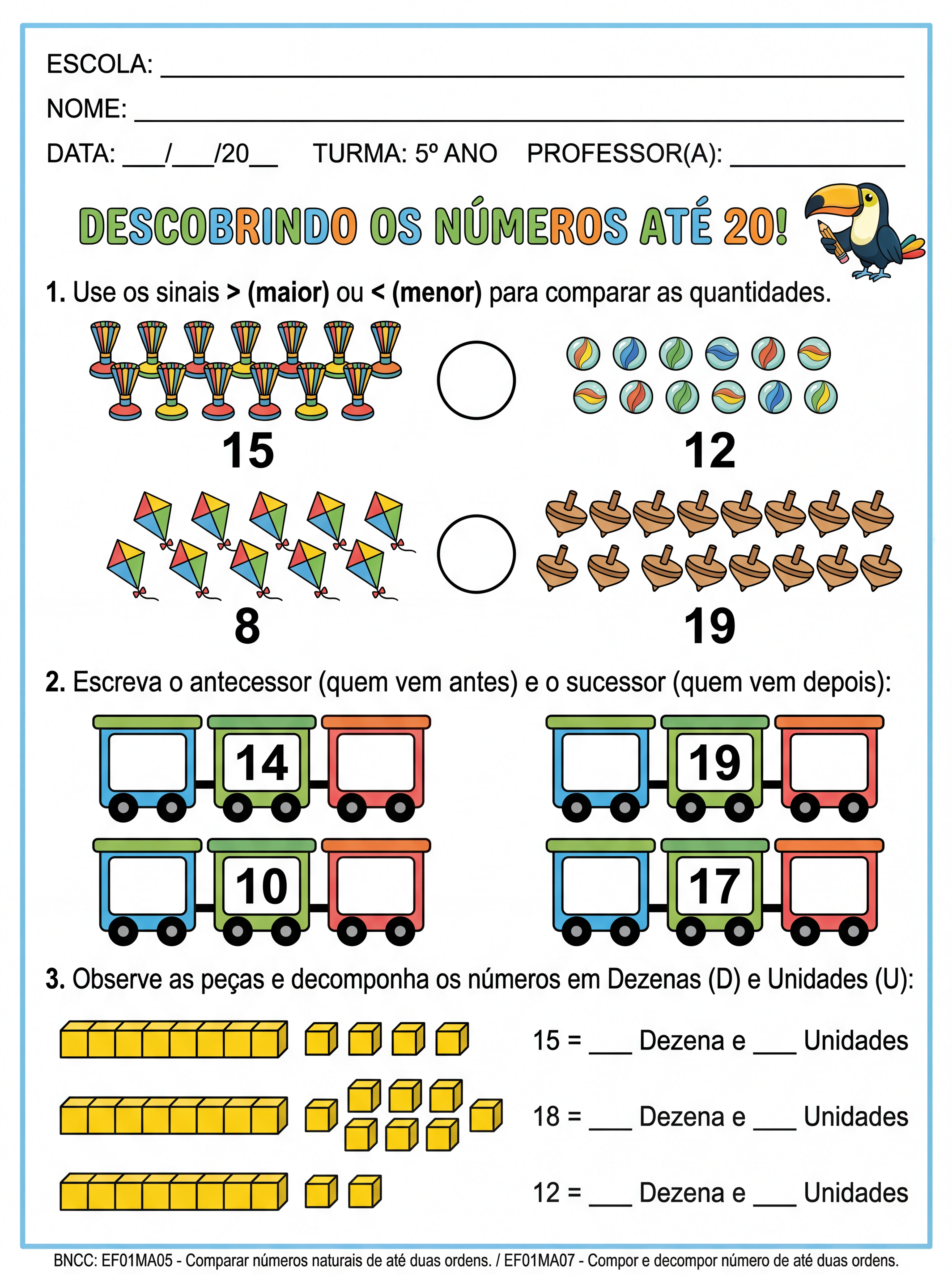 Elabore uma atividade com numerais até 20 de forma adaptada para um aluno do 5º ano. A atividade deve conter : sinal de maior ou menor, sucessor e antecessor , decomposição de unidade e dezena