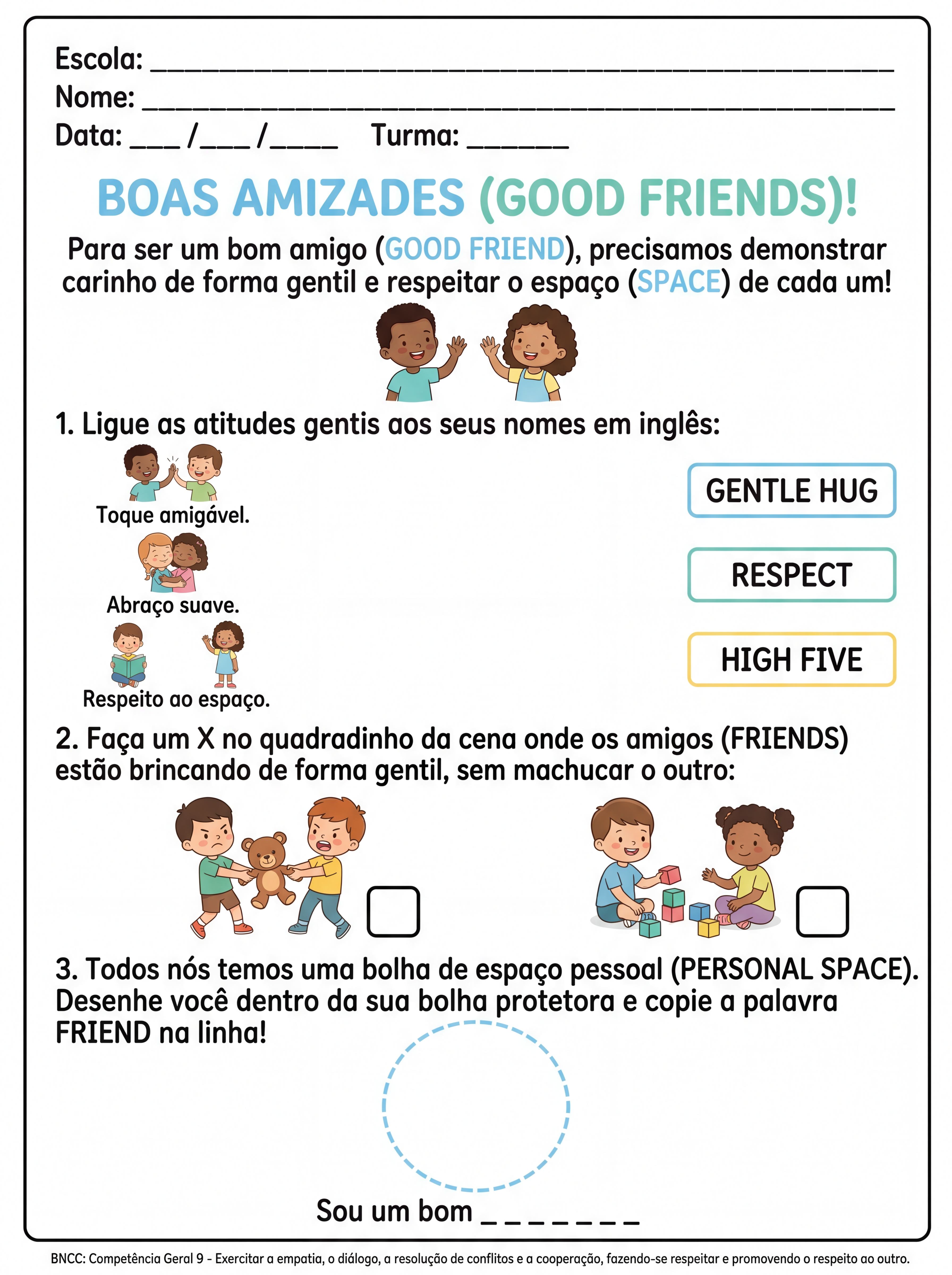 elabore uma atividade de ingles adaptada a nivel basico para um aluno de 5 ano . A atividade deve falar sobre amizade (friends). As instruções devem ser em português e as palavras chaves em inglês. O objetivo seria que ele respeitasse mais o espaço do outro pois ele é bruto na forma de demostrar carinho.