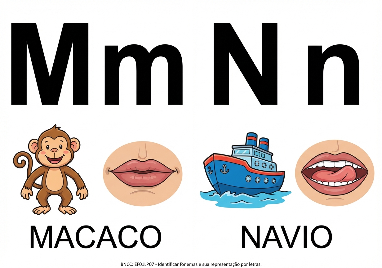 Faça o alfabeto fônico com a boquinha que representa o som. Letra em bastão maiúsculo e minúsculo. 2 letra por folha separada em 2 colunas , que caiba em toda a folha para impressão Tire o cabeçalho, as letras pontilhados, o título. Faça apenas as letras Mm, Nn com o desenho, na folha em formato paisagem Pinte as vogais em vermelho e as consoantes em preto Faça a letra maior do que o desenho