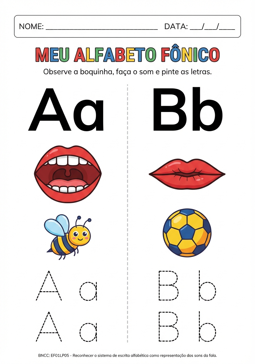 Faça o alfabeto fônico com a boquinha que representa o som. Letra em bastão maiúsculo e minúsculo. 2 letra por folha separada em 2 colunas , que caiba em toda a folha para impressão