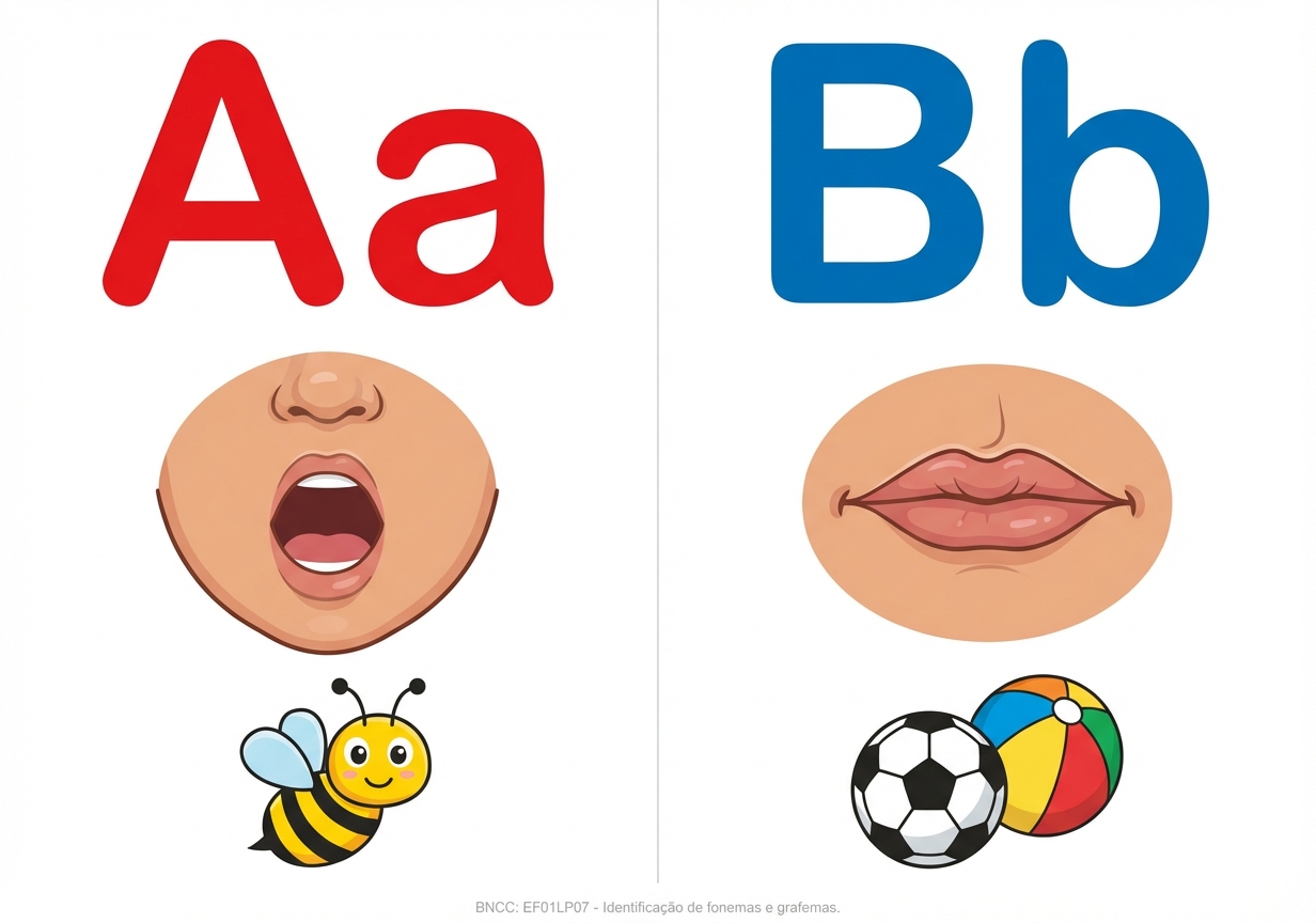 Faça o alfabeto fônico com a boquinha que representa o som. Letra em bastão maiúsculo e minúsculo. 2 letra por folha separada em 2 colunas , que caiba em toda a folha para impressão Tire o cabeçalho, as letras pontilhados, o título. Faça apenas as letras Aa, Bb com o desenho, na folha em formato paisagem