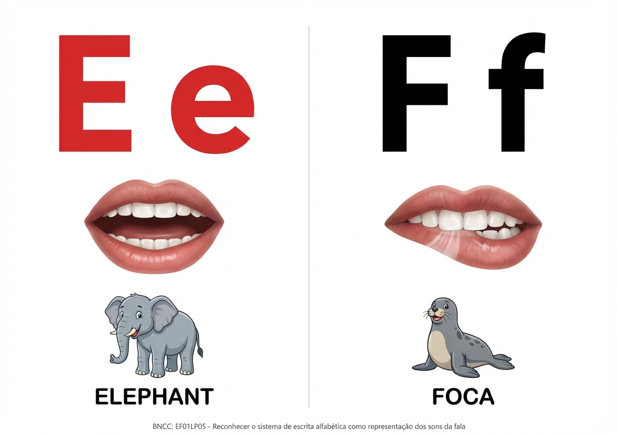 Faça o alfabeto fônico com a boquinha que representa o som. Letra em bastão maiúsculo e minúsculo. 2 letra por folha separada em 2 colunas , que caiba em toda a folha para impressão Tire o cabeçalho, as letras pontilhadas, o título. Faça apenas as letras Ee, Ff dcom o desenho, na folha em formato paisagem Pinte as vogais em vermelho e as consoantes em preto Faça a letra maior do que o desenho Faça o outro formato de boca