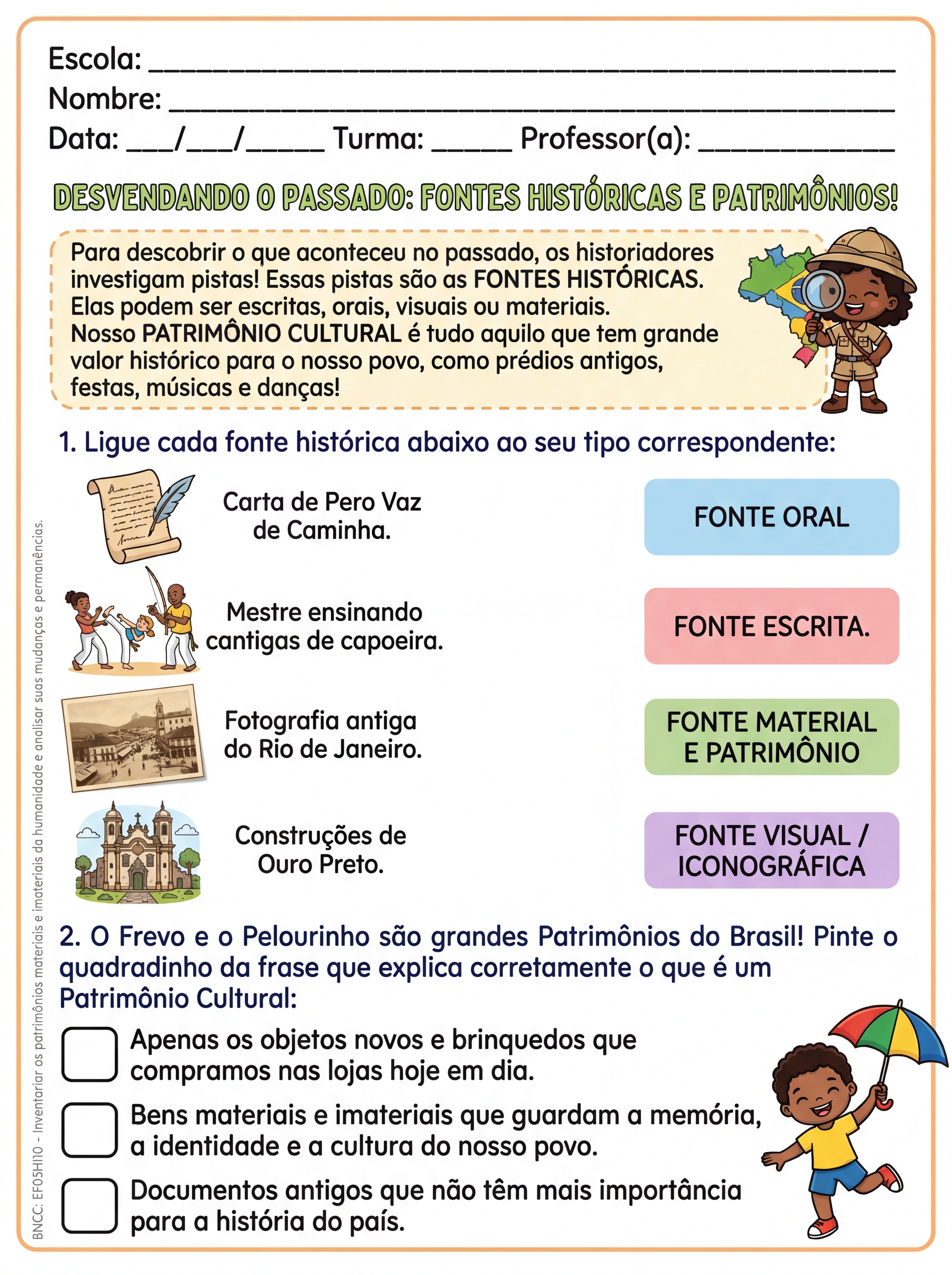 faça uma atividade adaptada para um aluno do 5º ano sobre : fonte história: iconografica, oral, visual, escrita e patrimônios