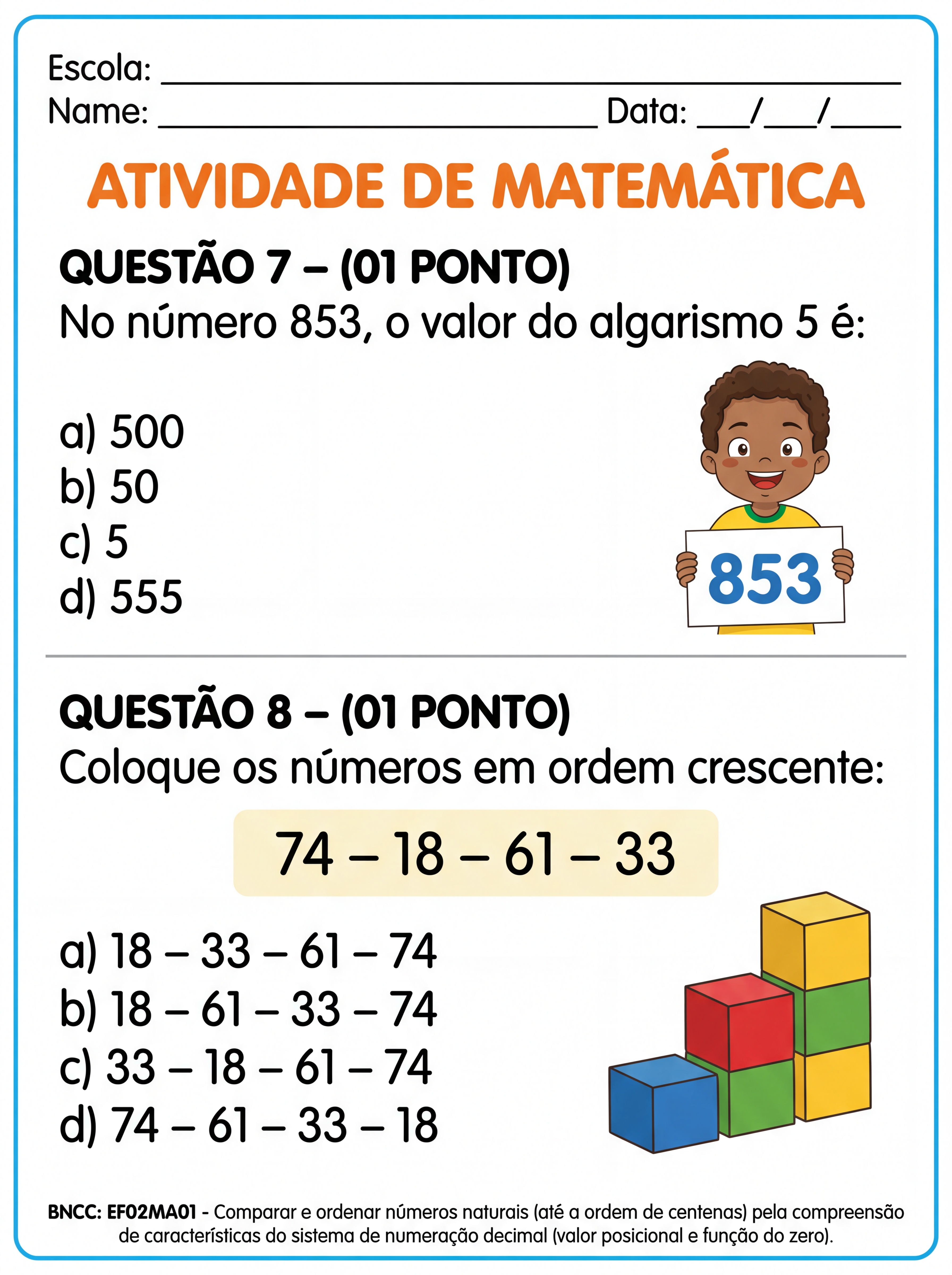 QUESTÃO 7 – (01 PONTO) No número 853, o valor do algarismo 5 é: a) 500 b) 50 c) 5 d) 555 QUESTÃO 8 – (01 PONTO) Coloque os números em ordem crescente: 74 – 18 – 61 – 33 a) 18 – 33 – 61 – 74 b) 18 – 61 – 33 – 74 c) 33 – 18 – 61 – 74 d) 74 – 61 – 33 – 18